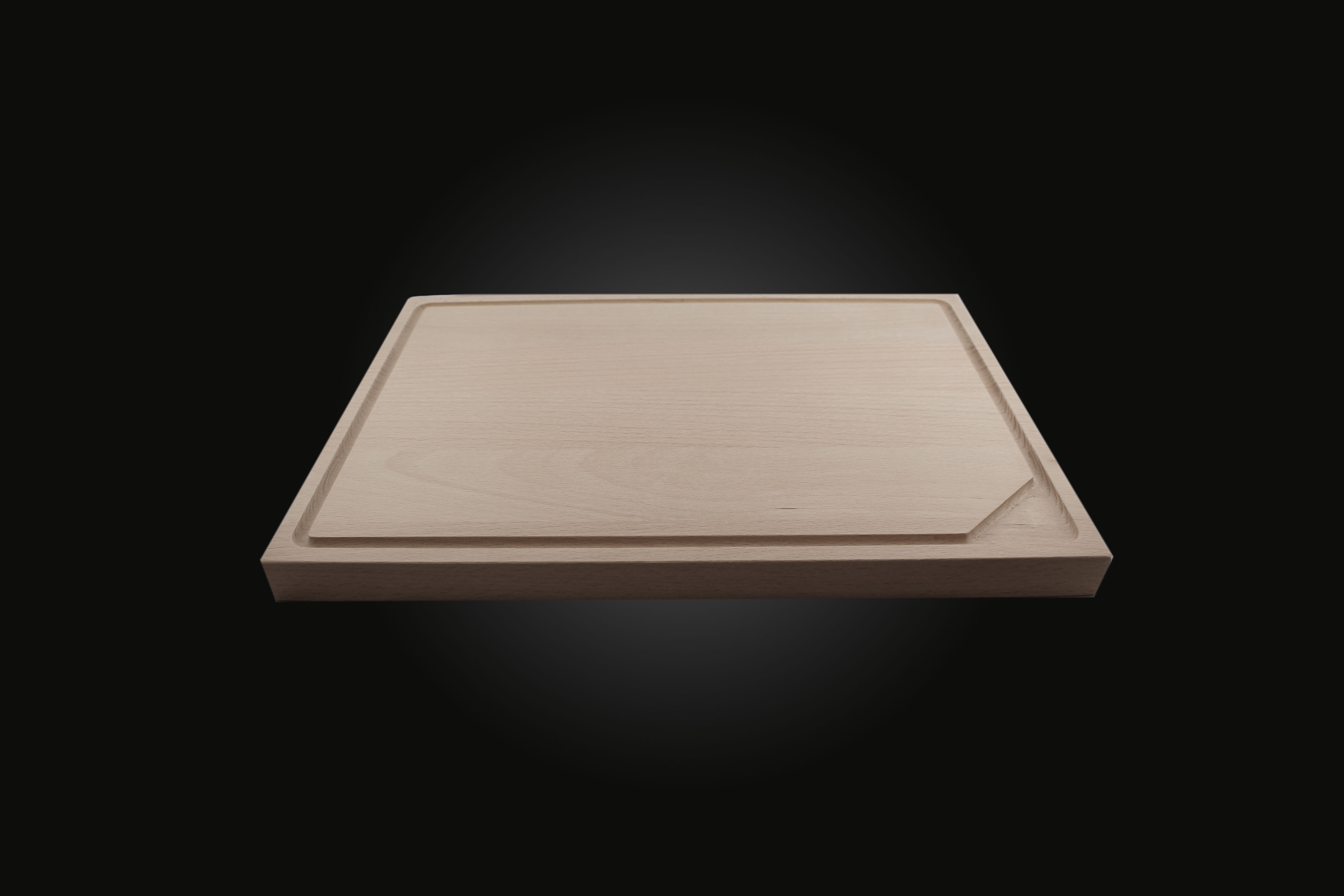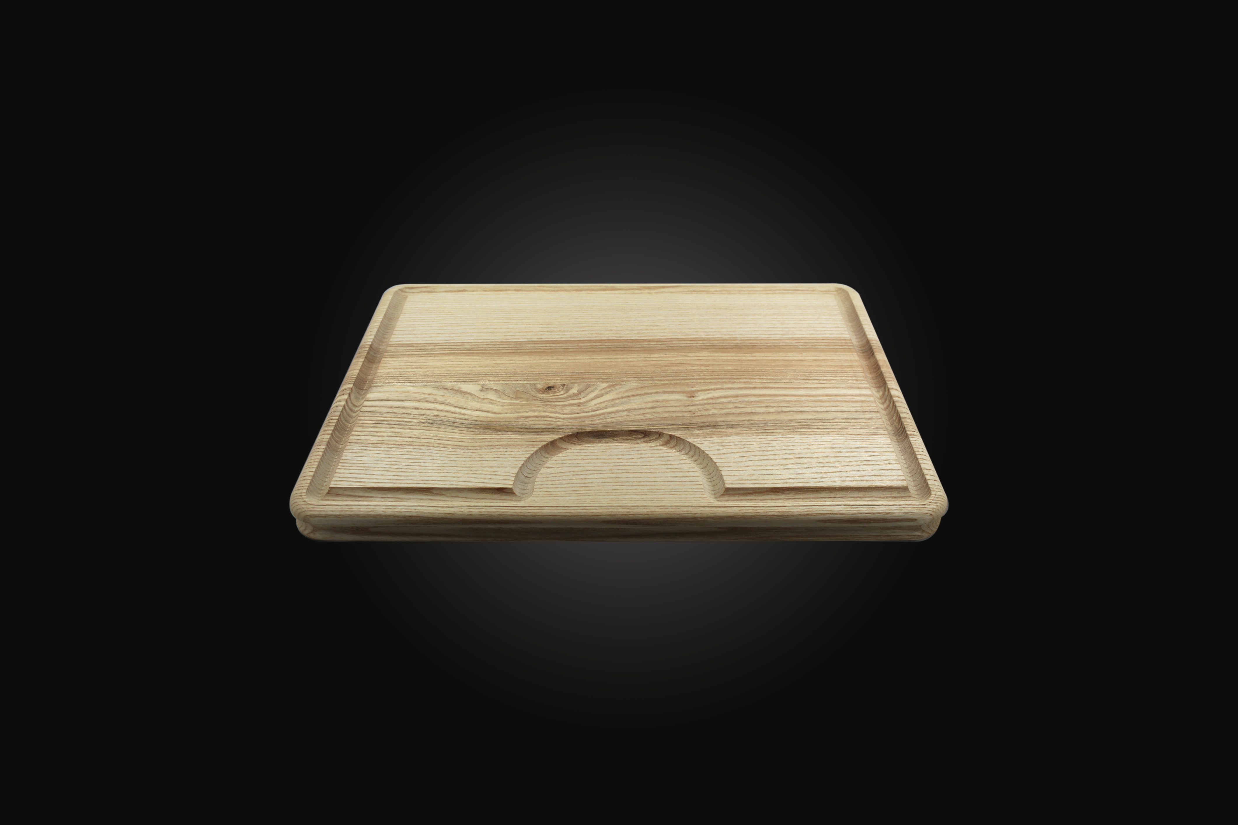 Chuchibrett «Eschi» Oberseite mit umlaufender Saftrille und Saftauffang, untere Seite glatt. Griffrundung für gutes Greifen, runde Ecken Esche massiv, geölt mit Komplex-Hartöl Grösse L x B x H: 36 x 24 x 2.6 cm