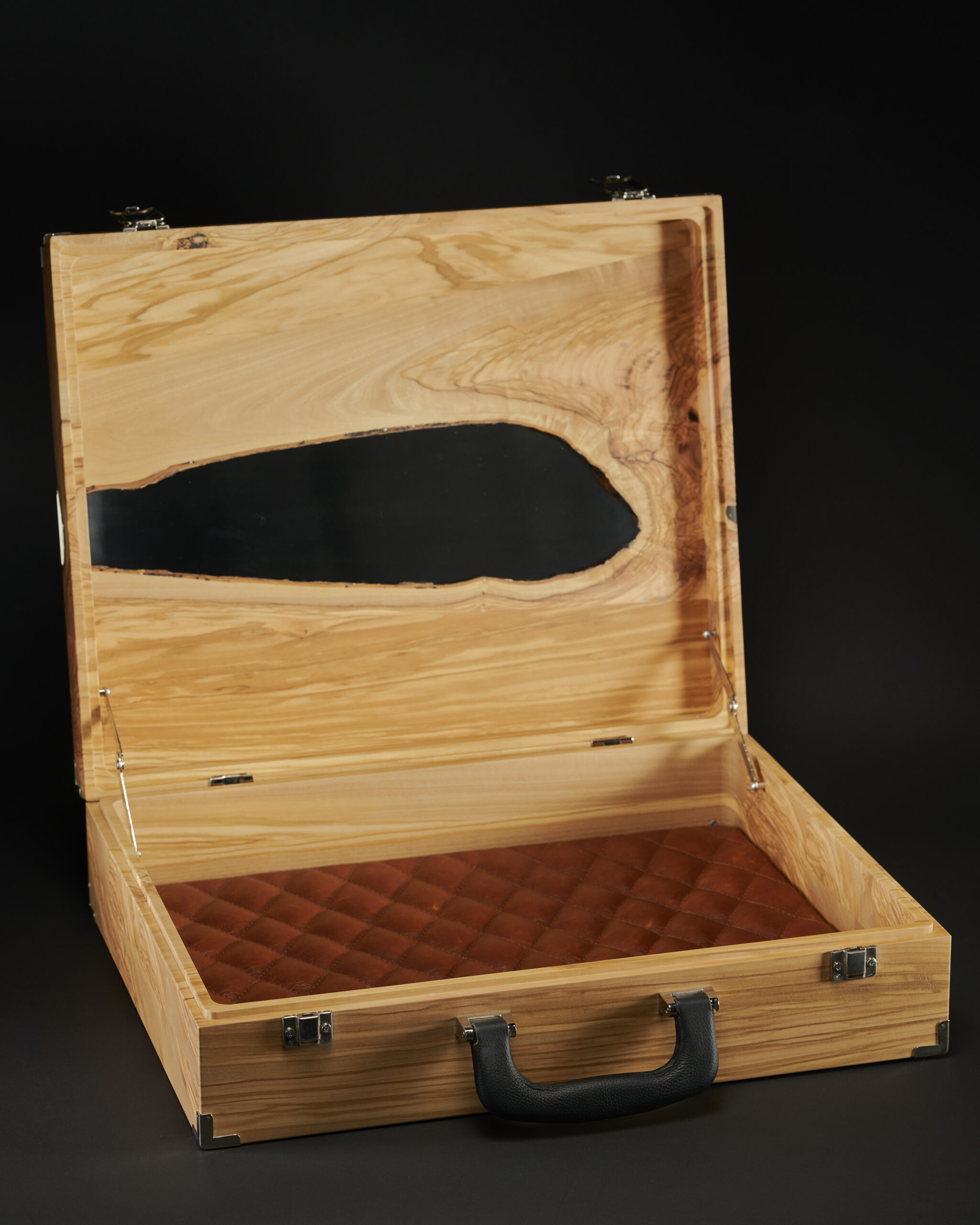 Holzkoffer “Olivia” Aus massivem Olivenholz, Deckel ausgeharzt mit Epoxyharz. Der Koffer ist ein Unikat und Einzelanfertigung. Ecken mit Edelstahlschutz, Griff Leder 2 Scharniere, 2 Verschlüsse und 2 Deckelscheren Innenboden mit braunem Leder gesteppt ausgekleidet Für den edlen Auftritt beim Kunden – ein echter Blickfang! Grösse L x B x H: 47 x 38 x 12 cm Holzkoffer "Olivia" Menge