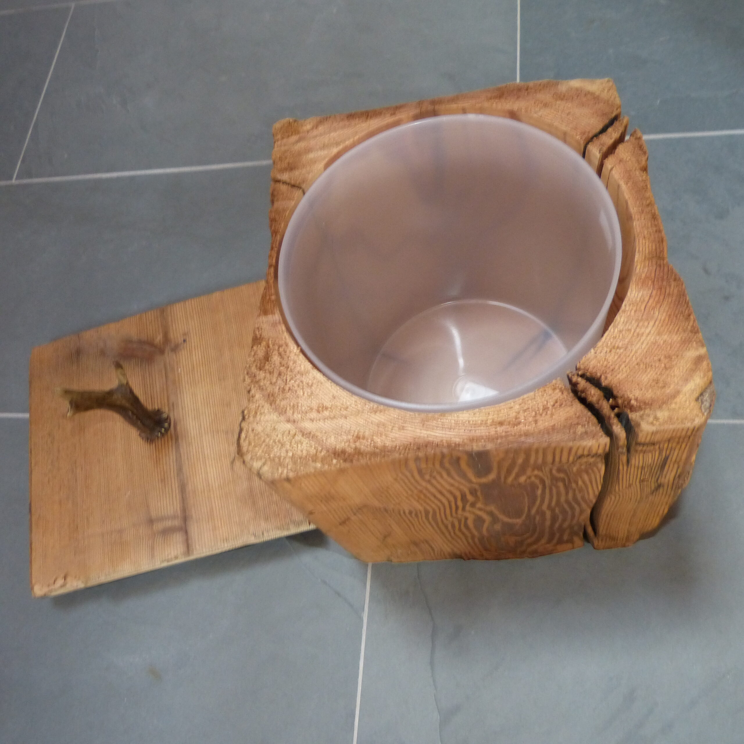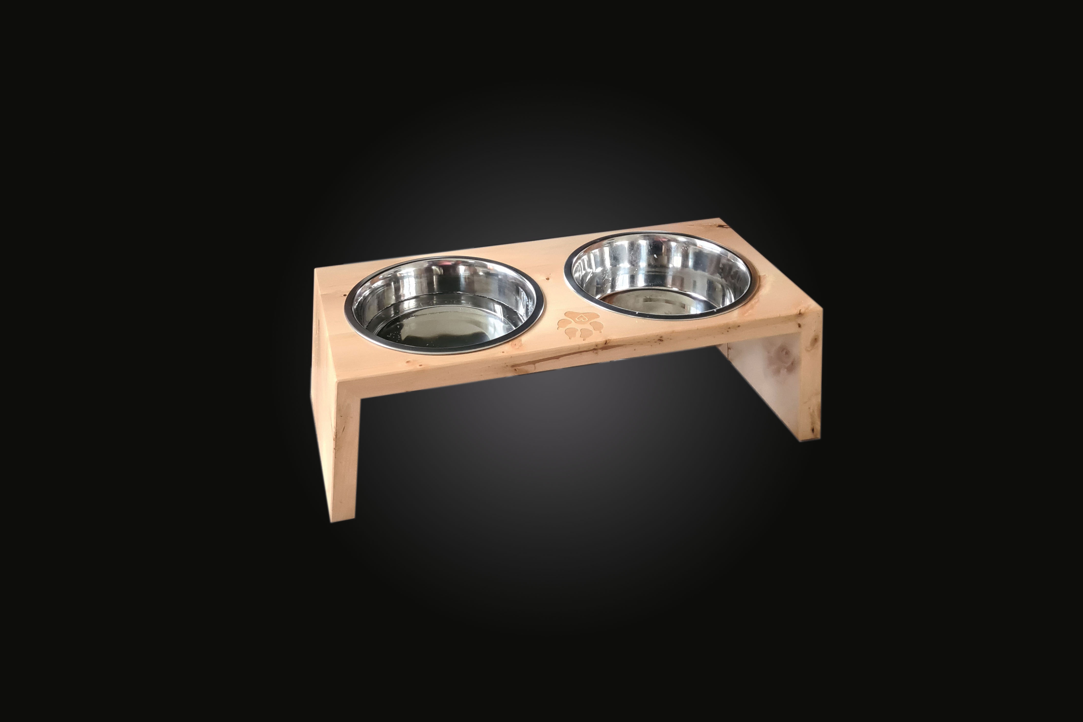 Edle und massive Futterstation mit zwei Lochbohrungen für Edelstahl-Fressnäpfe. Die seitlichen Sockel sind 7.1° geneigt. Erhältlich in Bündner Arve oder auch in Eiche wählbar. Auf Wunsch können wir ein dekoratives Laserbranding wie z.B. eine Pfote oder auch den Namen des Haustieres ins Holz lasern. Fast alles ist möglich, wir beraten Sie gerne. Die Fotos zeigen das Modell aus Arvenholz. Grösse S = für sehr kleine Hunde / für Katzen geeignet: Schalen 0.75 Liter mit Durchmesser 15 cm, Holzrahmen L x B x H: 43.2 x 19 x 13 cm Grösse L = für mittelgrosse Hunde geeignet: Schalen 1.80 Liter mit Durchmesser 20 cm, Holzrahmen L x B x H: 53.8 x 24 x 15.8 cm Grösse XL = für grosse Hunde geeignet (siehe Fotos in der Ansicht): Schalen 2.80 Liter mit Durchmesser 24 cm, Holzrahmen L x B x H: 64.5 x 28.2 x 19.8 cm