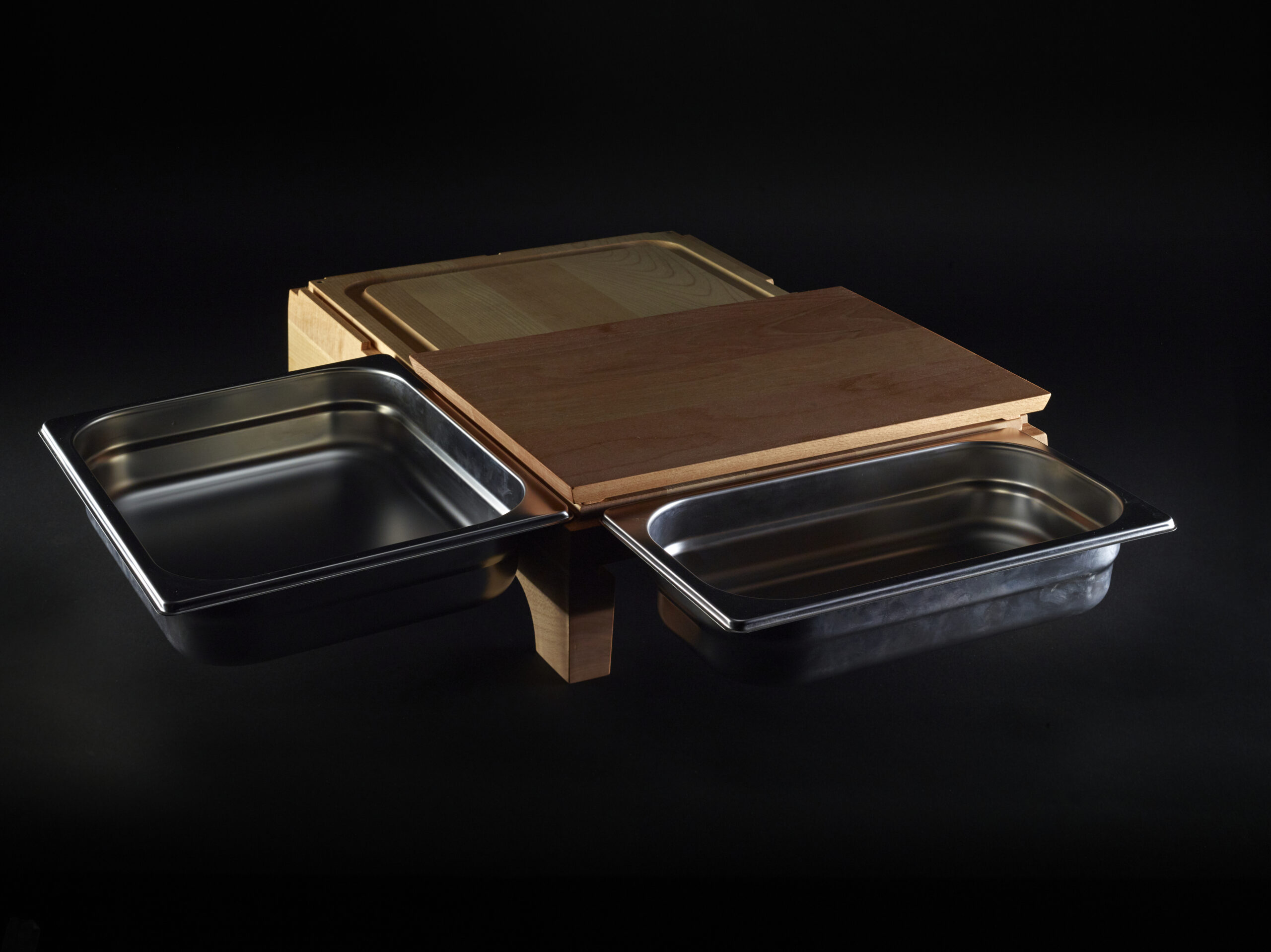 Koch-Rüststation standard 3-teilig 2 Rüstbretter in Buche massiv, 4-seitig angeschrägt zum Greifen/Halten, 4 Magnete eingebohrt Brett in Ahorn massiv, 2 Längsseiten mit Nute für Gastroschale zum Einschieben, 4-seitige Saftrille mit Gefälle, 2 Saftlöcher, 4-seitige obere Ausfräsungen für Gastroschalen zum Einhängen, 8 Magnete eingebohrt für Rüstbretter 4 Apparatepuffer für einen guten Halt Alle Holzteile geölt. Gastroschalen sind im Preis nicht enthalten. Brett Buche 2 Stück Grösse: 37 x 27 x 2 cm Brett Ahorn Grösse: 54 x 37 x 3.2-10.7 cm