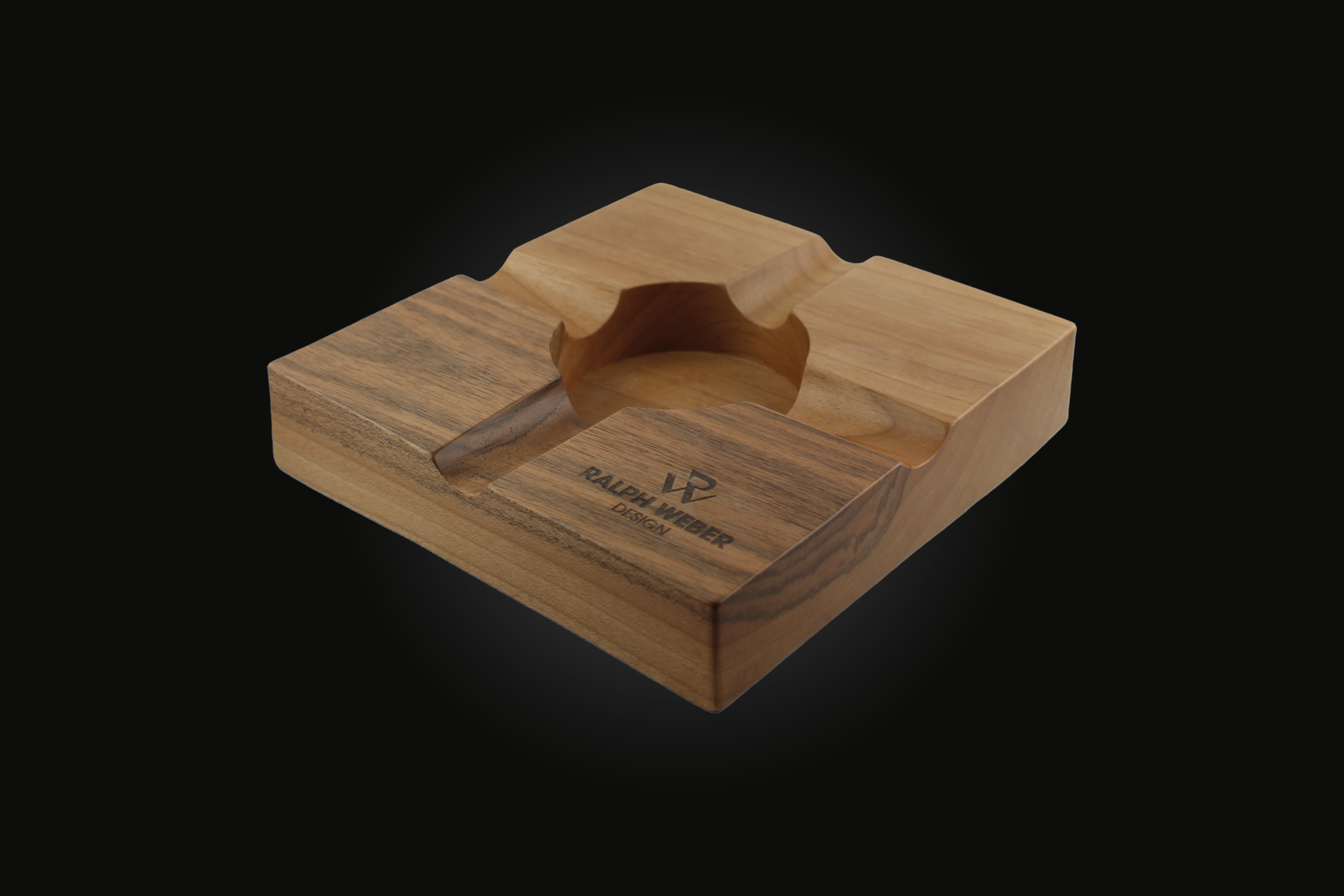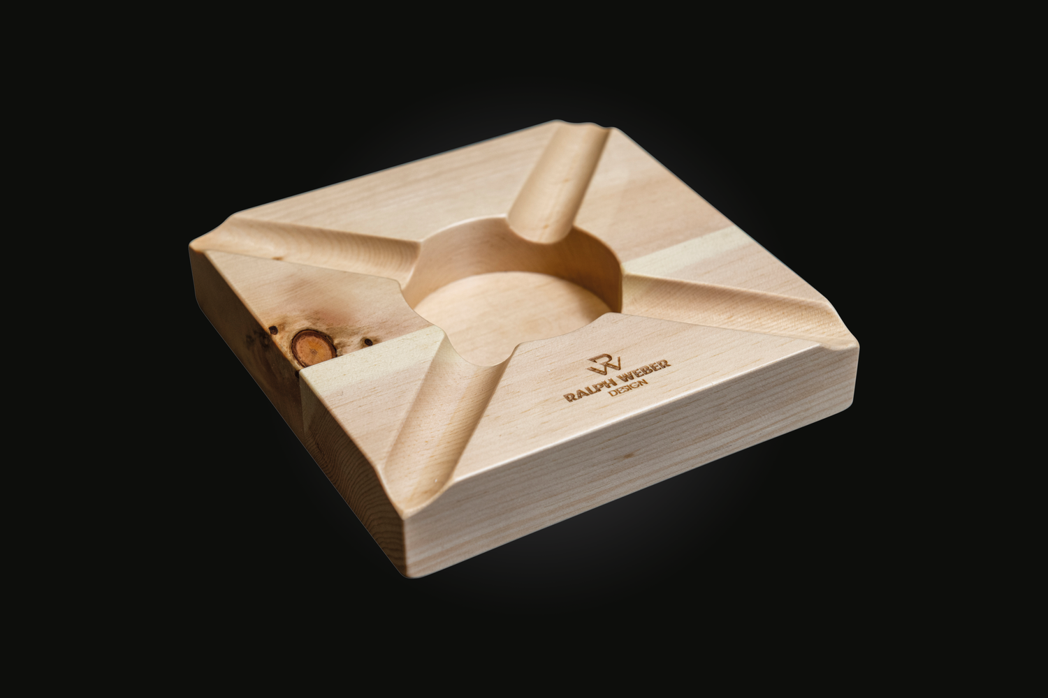 Aschenbecher “Cigarros” lackiert, 4-eckig, quadratisch, für 4 Zigarren. Jeder Aschenbecher ist ein Unikat, farbliche Abweichungen sind möglich. Erhältlich in den Holzarten Nussbaum und Arve Weitere Holzarten auf Anfrage. Grösse 17 x 17 cm