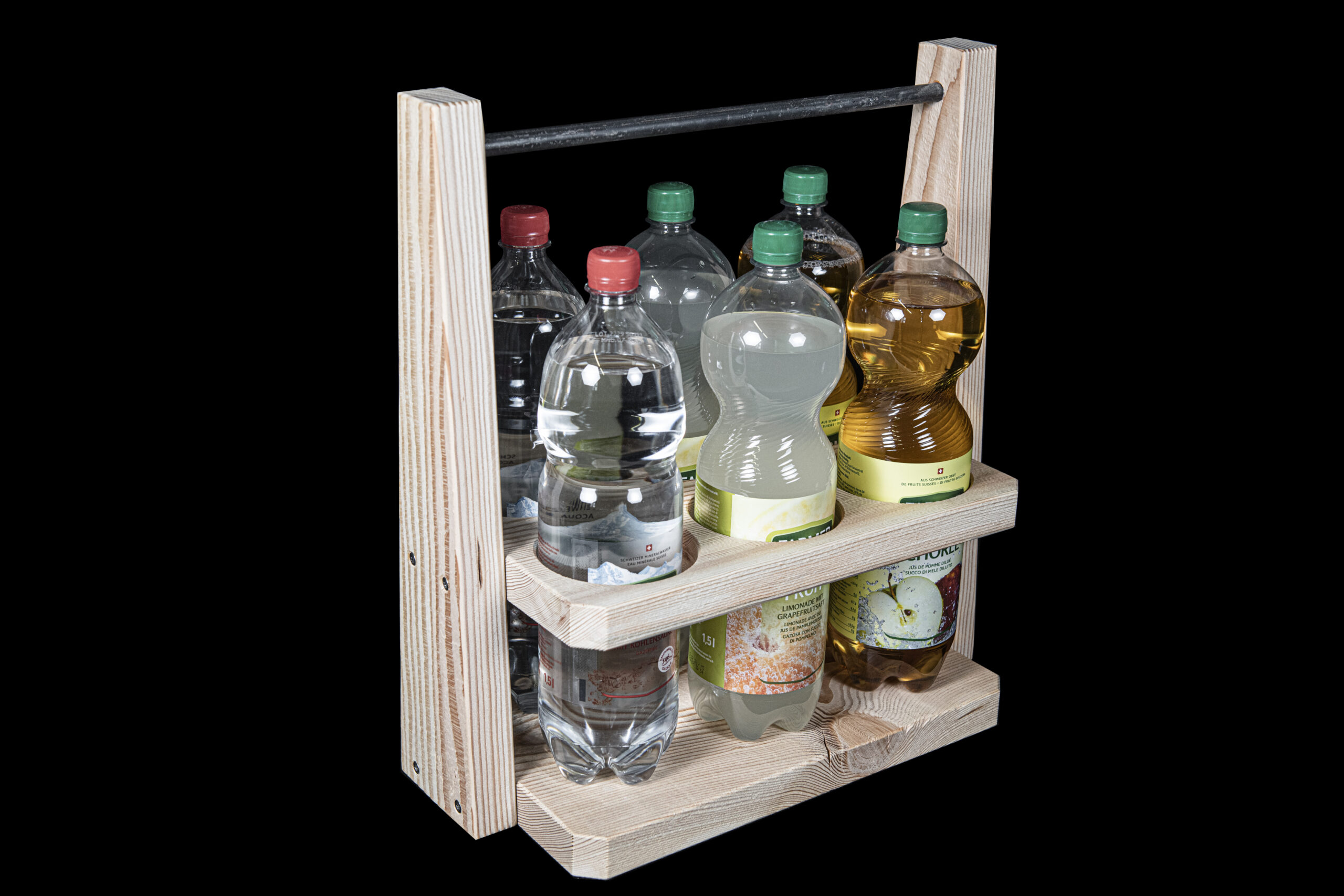 Trage-Harass “Peti” für 6 PET-Flaschen 1.5 Liter, Lärche massiv mit Tragestange Eisen roh schwarz (Durchmesser 1.2cm) Grösse L x T x H: 40.5 x 24 x 45 cm