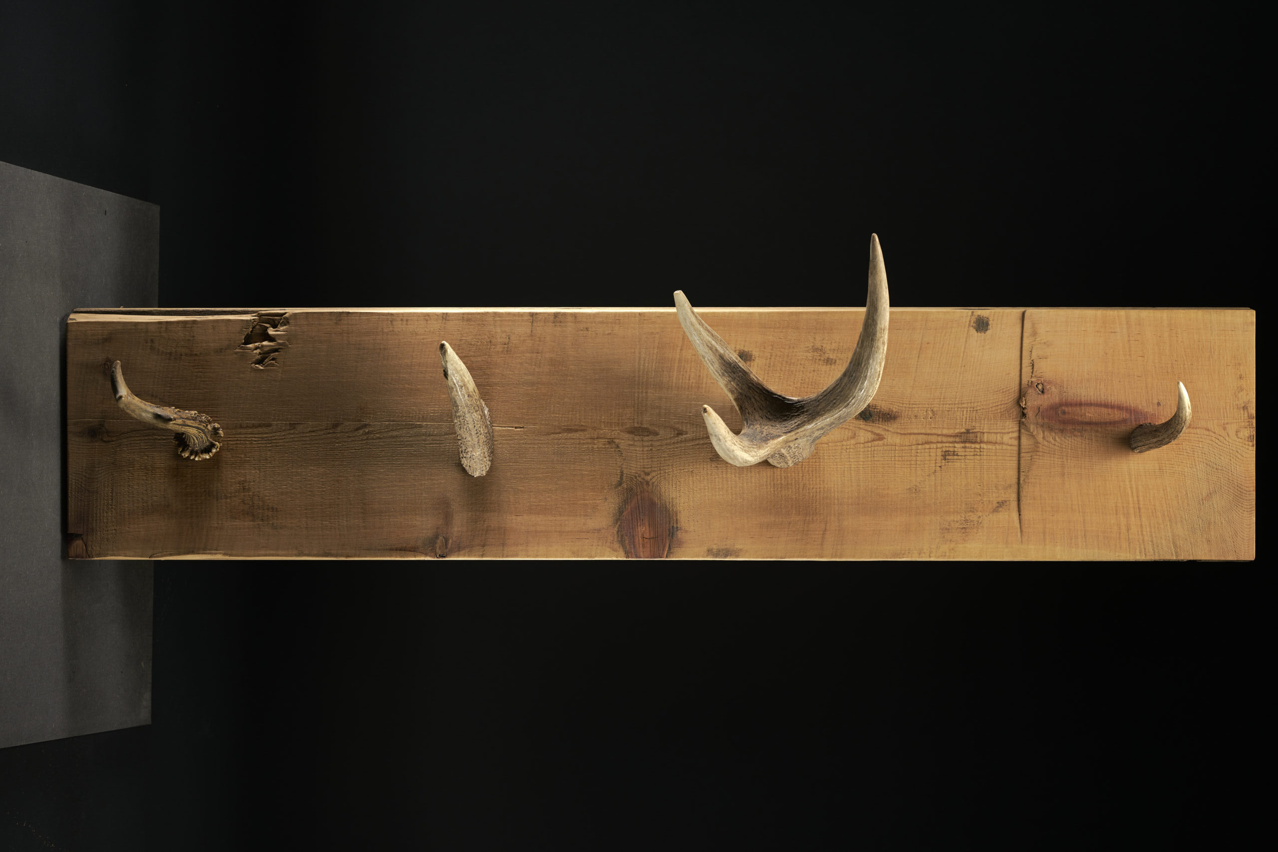 Garderobe “Wildi” mit 4 Geweihstücken. Brett Altholz Arve, konisch, rückseitig 2 Aufhängebeschläge für Wandmontage. Rustikaler, hölziger Alpen Chic Grösse L x B x H: ca. 89.5 x 20 x 3.4 cm