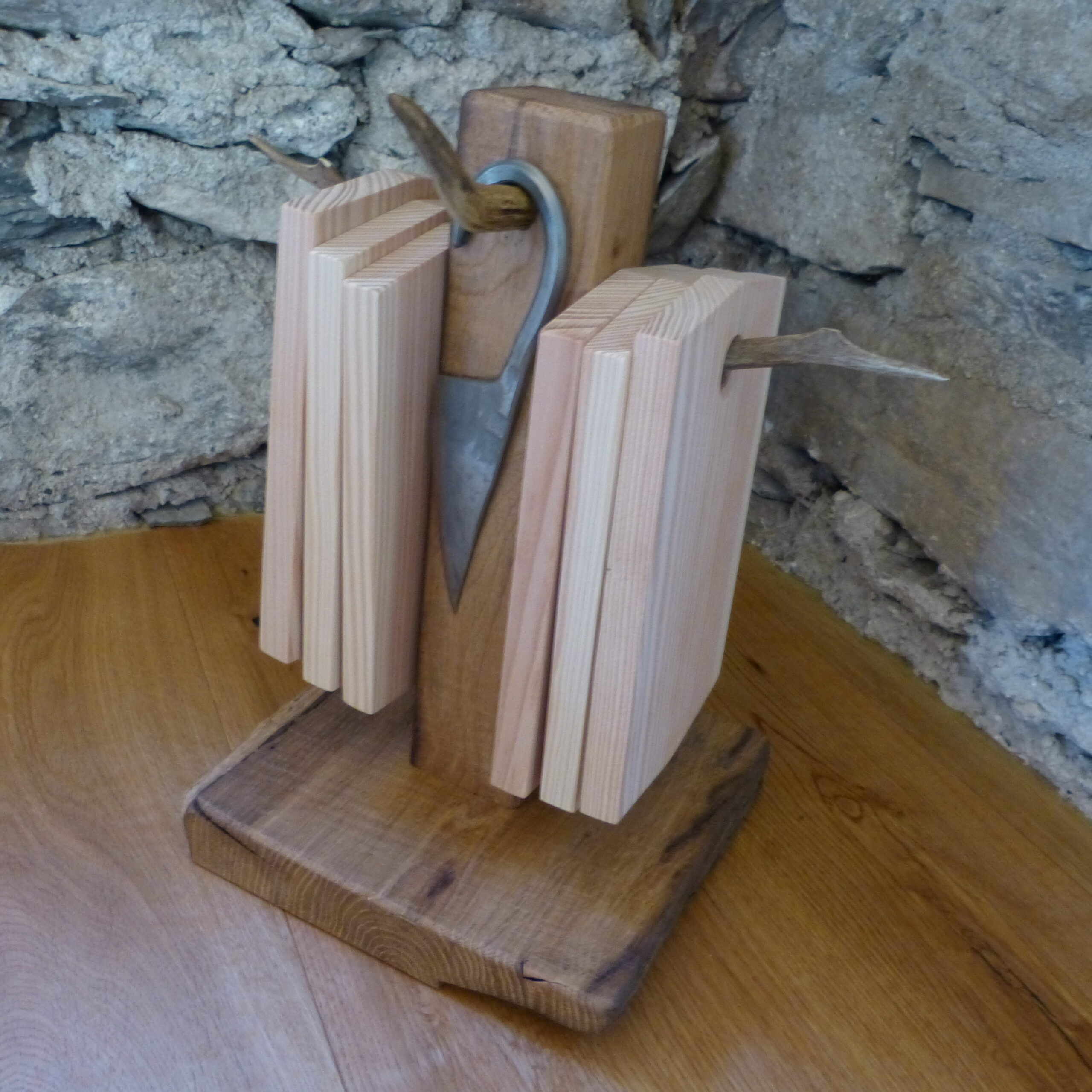 Salsiz-Brettli-Ständer “Curdin”. Sockel und Ständer aus Altholz Eiche, rustikal gebürstet, 3 Rehgeweih als Halter für Messer und Holzbrettli, 6 Stück Holzbrettli Lärche in Grösse 21 x 12.5 x 1.7 cm. Das Salsizmesser muss separat gekauft werden. Grösse Messer L x B x H: ca. 22 x 20 x 34 cm