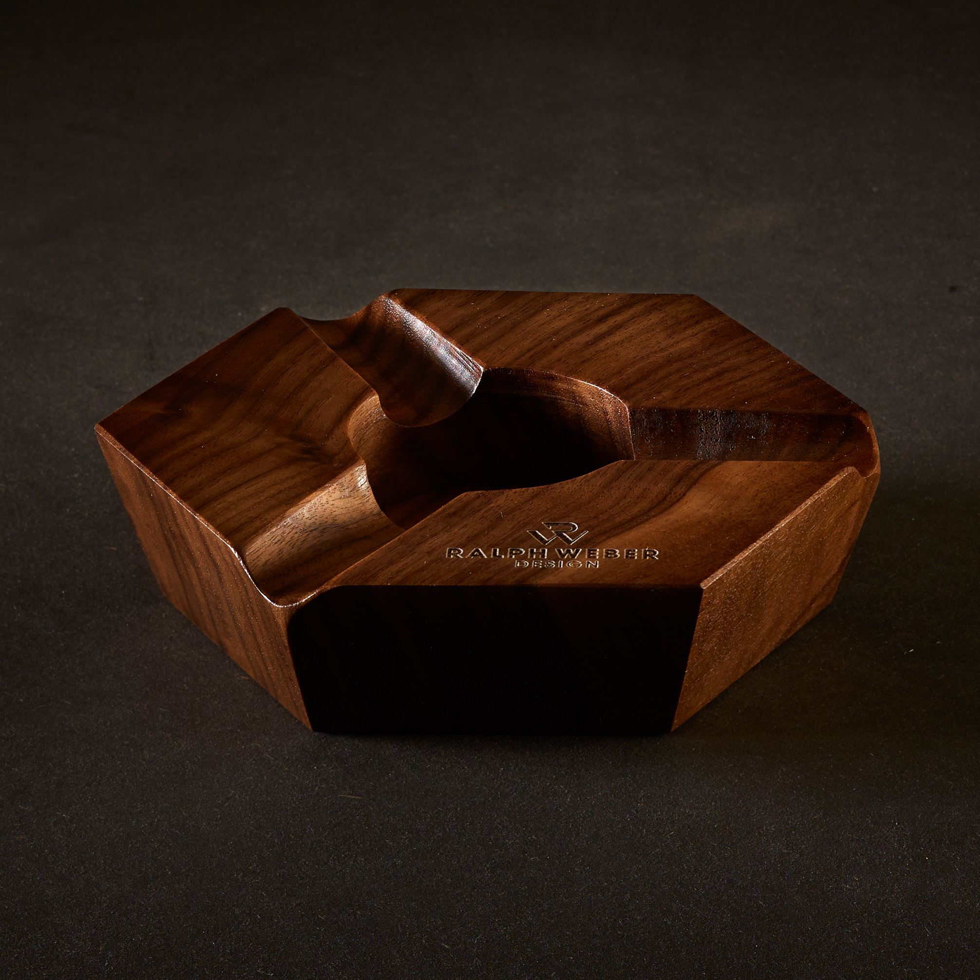 Aschenbecher “Zigarra” lackiert, 6-eckig, für 3 Zigarren, jeder Aschenbecher ist ein Unikat, farbliche Abweichungen sind möglich. Holzart: Nussbaum Grösse: 15 x 15 cm