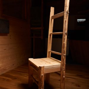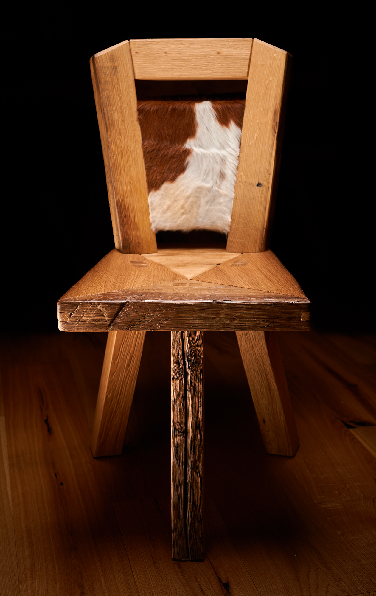 Stuhl “Mitgeli” Alpen Chic, aus 7.1°/17°-Line, 3-beinig, Eiche Altholz, rustikal gebürstet, lackiert, Stuhlbeine und Stuhllehne gezäpft und verkeilt, (Handwerksverbindungen) Sitzfläche gegehrt mit Sitzwölbung, Rücklehne mit Kuhfell. Grösse L x B x H: 47 x 41 x 85 cm