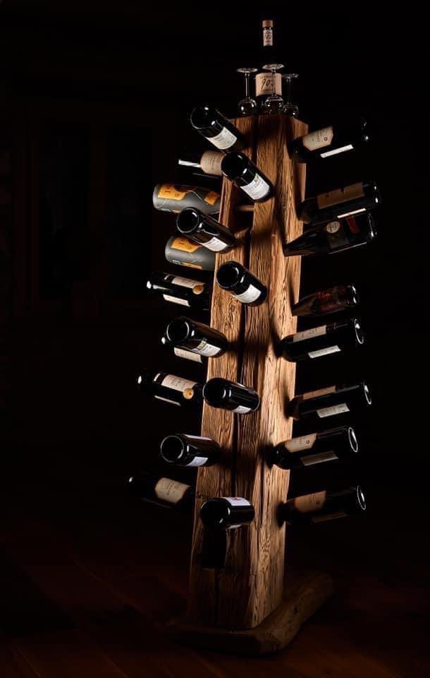 Wein- und Grappaständer “Ela”, Holzbalken Altholz Fichte, auf 3 Seiten Lochbohrungen 7.1° für total 24 Weinflaschen, oben 4 Lochbohrungen für 4 Grappagläser und 1 Lochbohrung für Grappaflasche. Sockel aus Brett Altholz Eiche, alles rustikal gebürstet. Weinflaschen sind nicht enthalten. Passende Grappaflasche und 4 Grappagläser können separat bestellt werden. Höhe ca. 139 cm Sockel ca. 60 x 32 x 5 cm