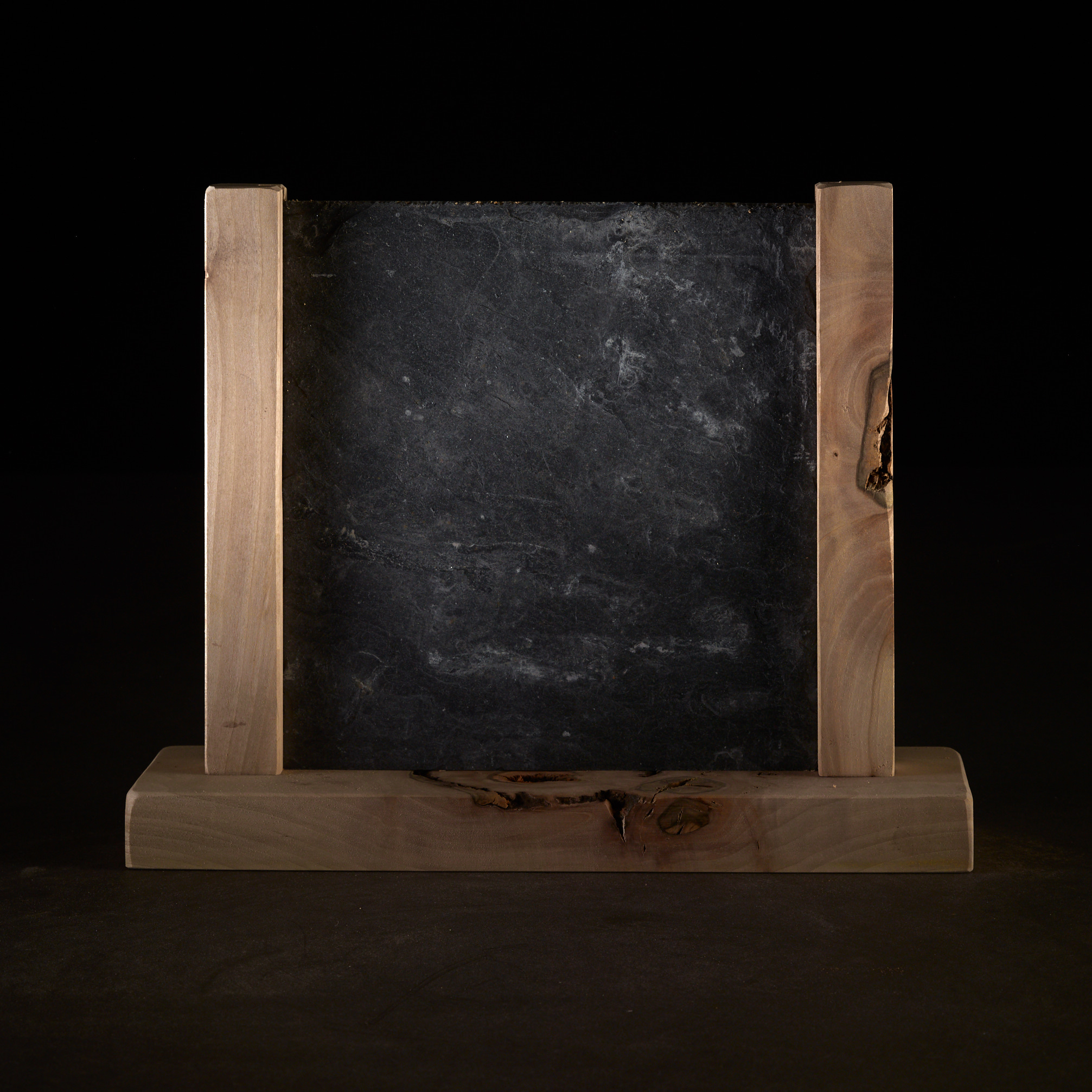 Steller mit Holz/Schiefer. Sockel aus Holz mit 2 Pföstli. Schieferplatte in Pföstli eingenutet. Schieferplatte ist lose eingeschoben. Erhältlich in Eiche Altholz rustikal und Arve. Schieferplatte kann beidseitig mit Kreide beschriftet werden. Ideal zum Präsentieren von etwas Feinem, Speziellem oder Gutem. Auch als Infotäfeli verwendbar. Grösse L x B x H: 36 x 10 x 30 cm. Schiefertafel 25 x 25 cm