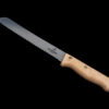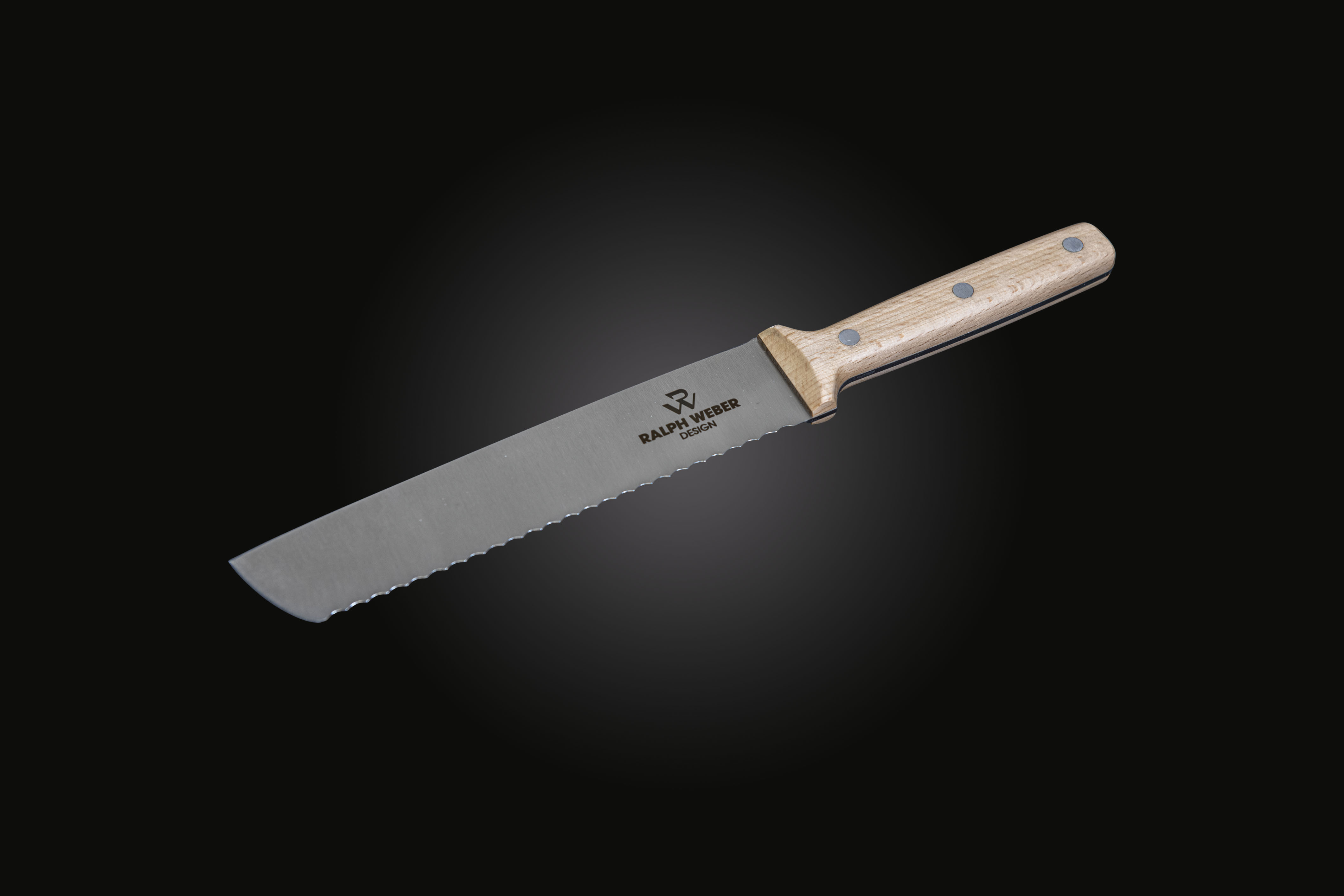 Formschönes Brotmesser mit extra scharfem Wellenschliff. Schneidet mühelos knusprige Brotlaibe und jede Art von Backwaren. Brotmesser mit Oliven-, Buchen-, Nussbaum-, oder Mooreichen-Holzgriff und Messingnieten, mit schwarzer Kartonhülle Gesamtlänge 33 cm Klingenlänge 20 cm