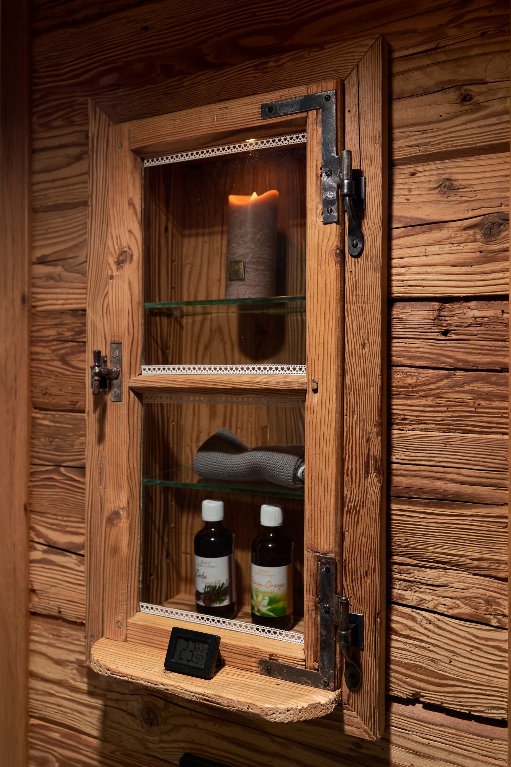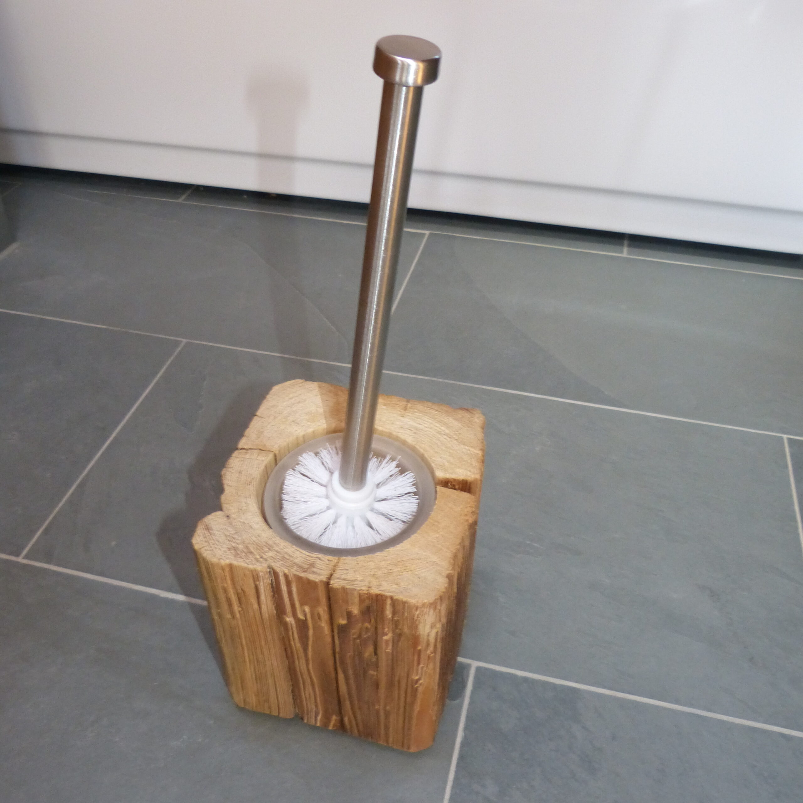 WC-Bürstenhalter “Alpi”. Holzklotz Fichte Altholz, rustikal gebürstet, 1 Lochbohrung für Glaseinsatz von WC-Besen. Inkl. Glas mit WC-Besen Edelstahl. Grösse H x B x T ca. 16 x 16 x 14 cm