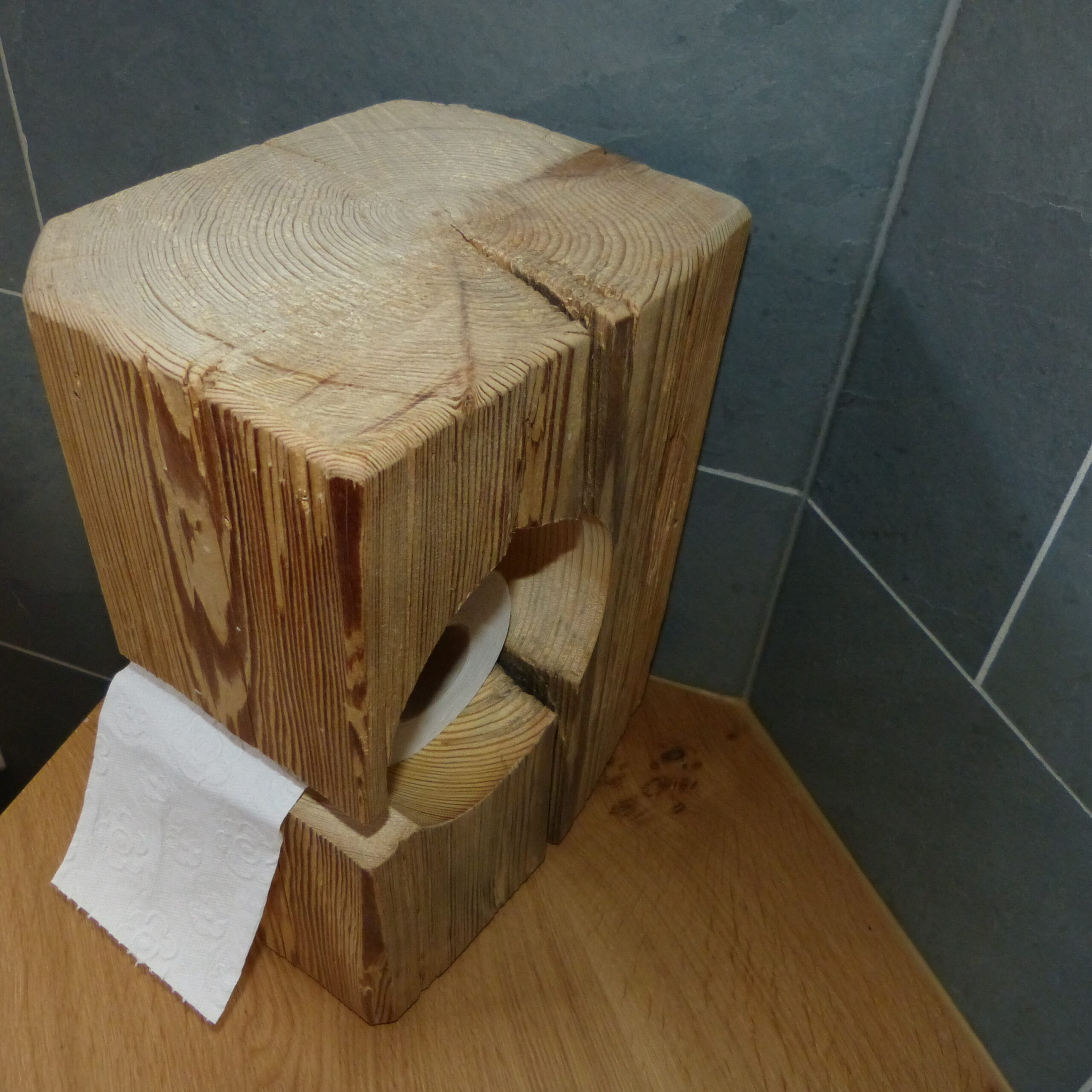 WC-Rollenhalter “Alpe”. Holzklotz Fichte Altholz, rustikal gebürstet. 1 Lochbohrung mit Schlitz für WC-Rolle. Grösse H x B x T: ca. 29 x 16 x 22 cm