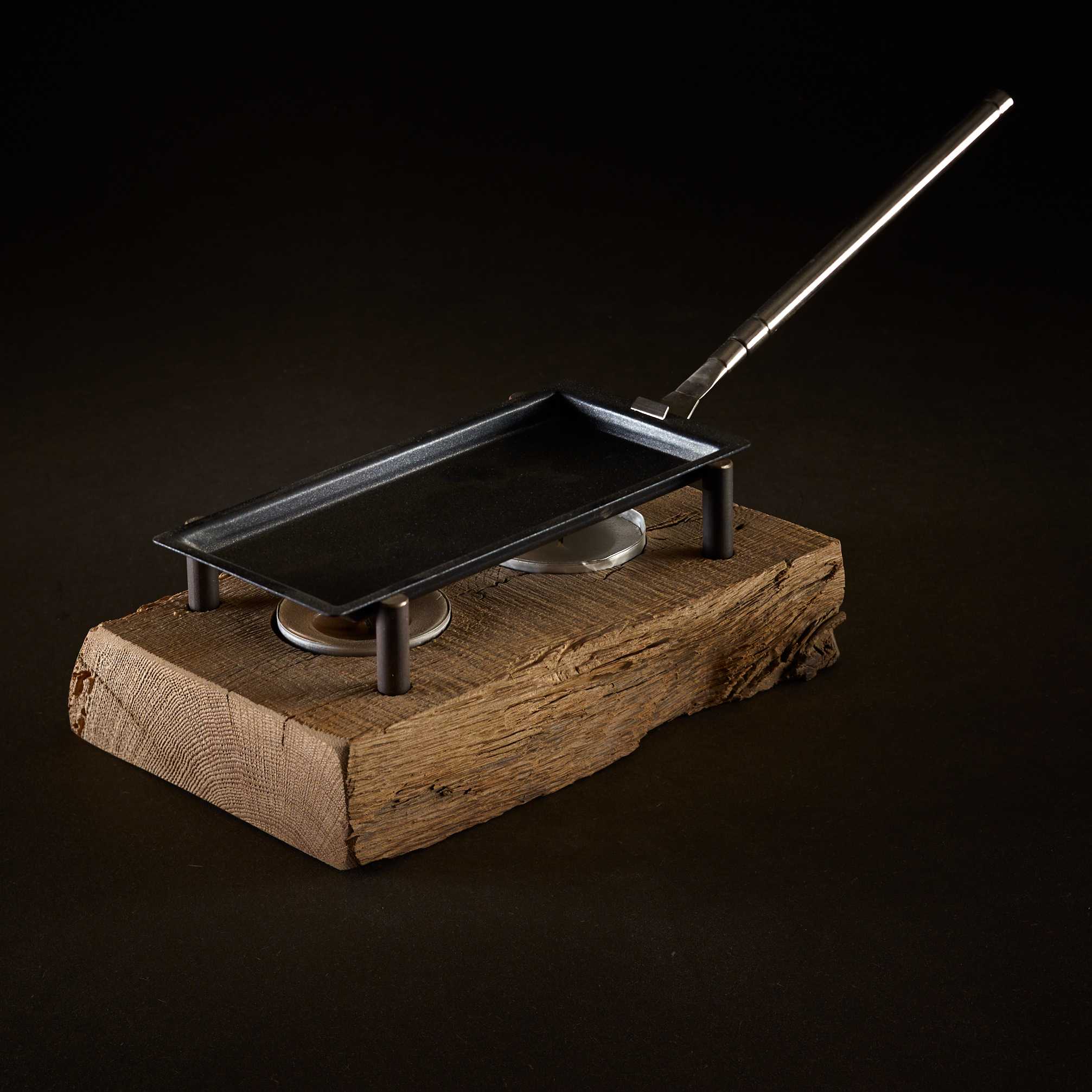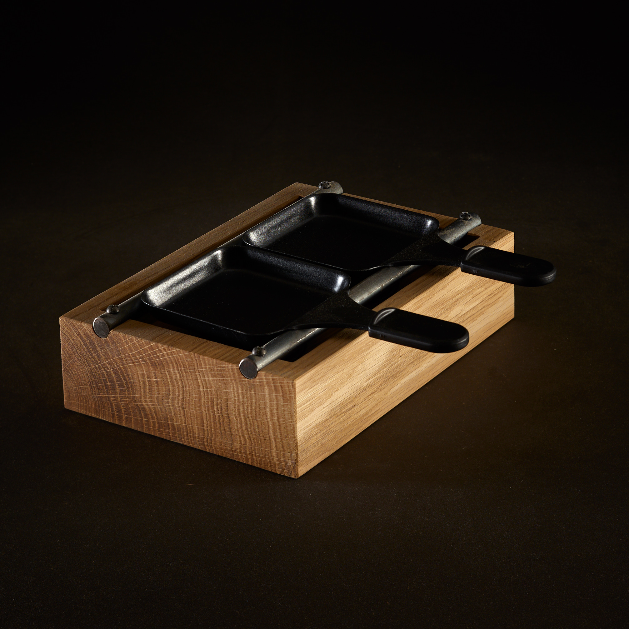 Holz-Raclette 1er “Singlos Doppio” Eiche, rustikal gebürstet, Holzklotz mit 4 Eisenhalter für Doppel-Raclettepfännli, inkl. 1 Raclette-Pfännli mit Teleskopgriff für 2 Käsescheiben, inkl. 1 Spachtel, 2 Gläsli inkl. Rechaudkerzli gross, d=60 mm, ideal für ein gemütliches und romantisches Raclette zuhause oder im Freien. Erhätlich in den Holzarten Eiche und Lärche rustikal gebürstet. Andere Holzarten auf Anfrage. Grösse 145×230 mm