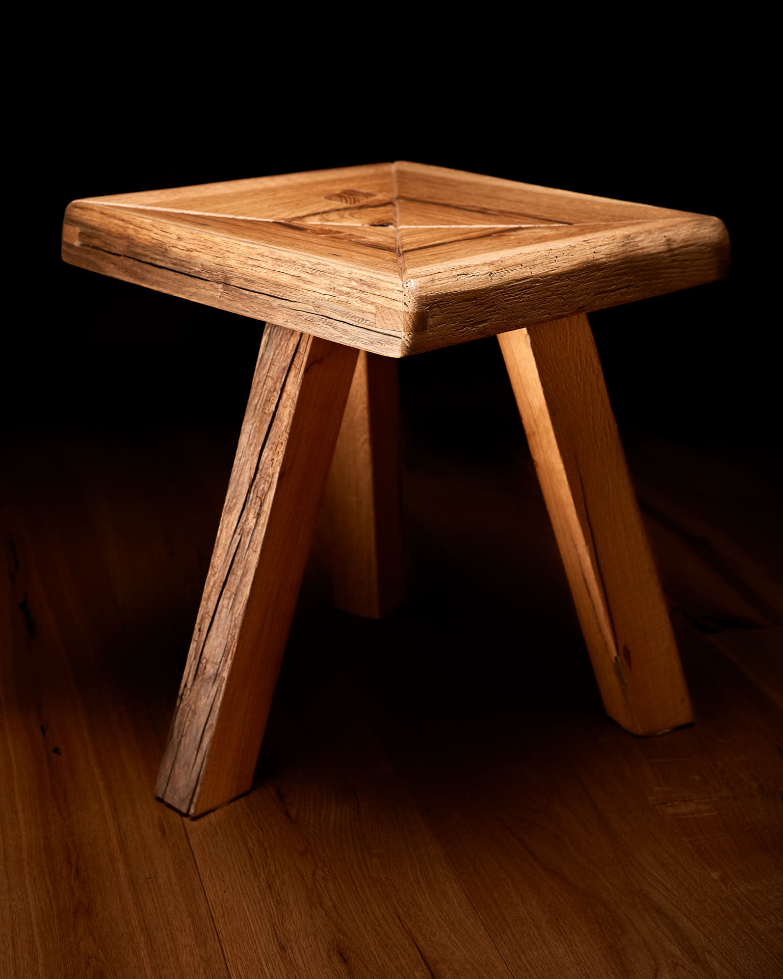 Hocker “Mitgela” Alpen Chic, aus 7.1°/17°-Line, 3-beinig, Eiche Altholz, rustikal gebürstet, lackiert, Stuhlbeine gezäpft und verkeilt, (Handwerksverbindungen) Sitzfläche gegehrt mit Sitzwölbung. Grösse L x B x H: 40 x 40 x 45 cm