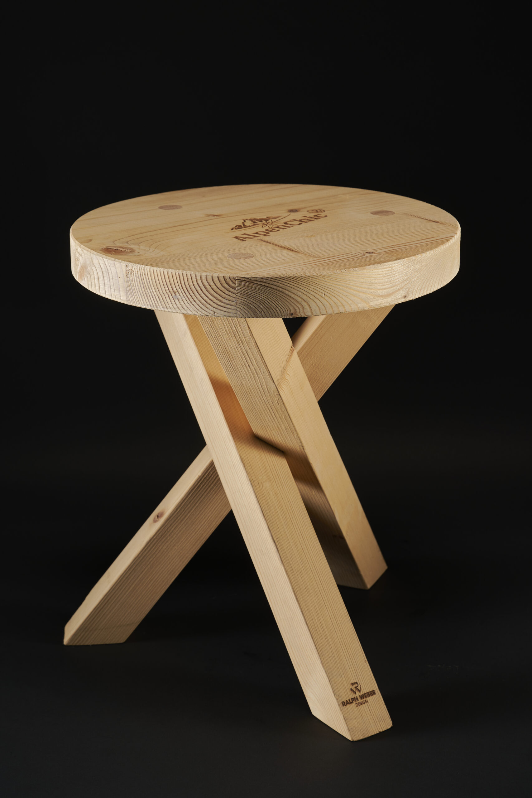 Hocker “Alpen Chic” 3 Beine mit 3 gekreuzten Hölzern, aus Fichte gedämpft und gebürstet Grösse Durchmesser: 38 cm, Höhe 85 cm