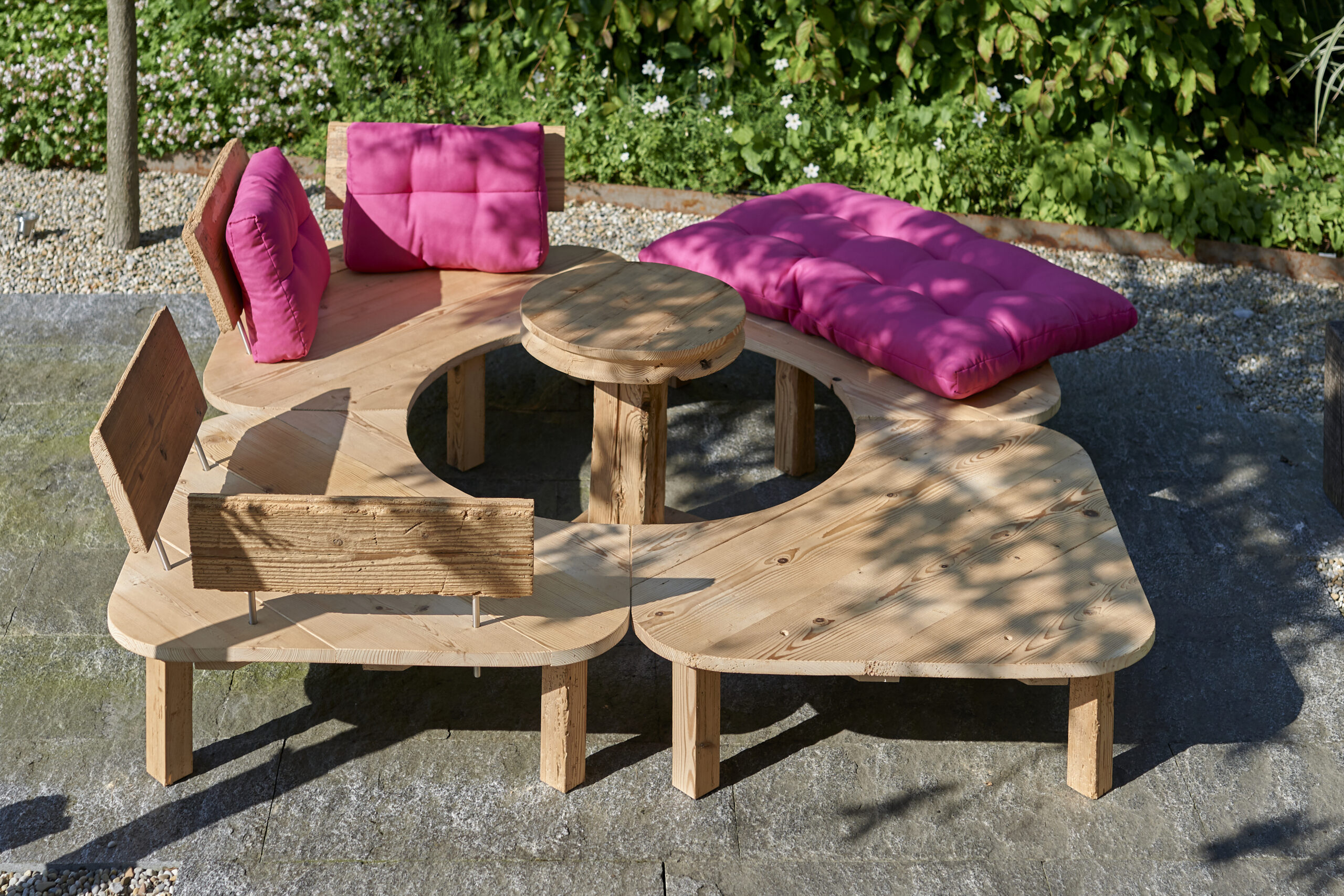 Lounge mit 4 Loungsitzen (4 x 1/4). Zusammengestellt gibt dies ein Quadrat mit einem Kreis in der Mitte. Pro Loungsitz 4 Füsse, In der Mitte ist das Tischli. In den Loungsitzen hat es Bohrungen für die Rückenlehne. Die Rückenlehnen sind demontierbar Alles aus Altholz Fichte rustikal gebürstet Sitz L x B x H: 110 x 110 x 35 cm Tisch Durchmesser: 56 cm / Höhe 65 cm Mehrpreis für Rückenlehne gepolstert mit Fell oder Leder 280.00 CHF Mehrpreis für Sitzfläche mit Kunstleder 400.00 CHF