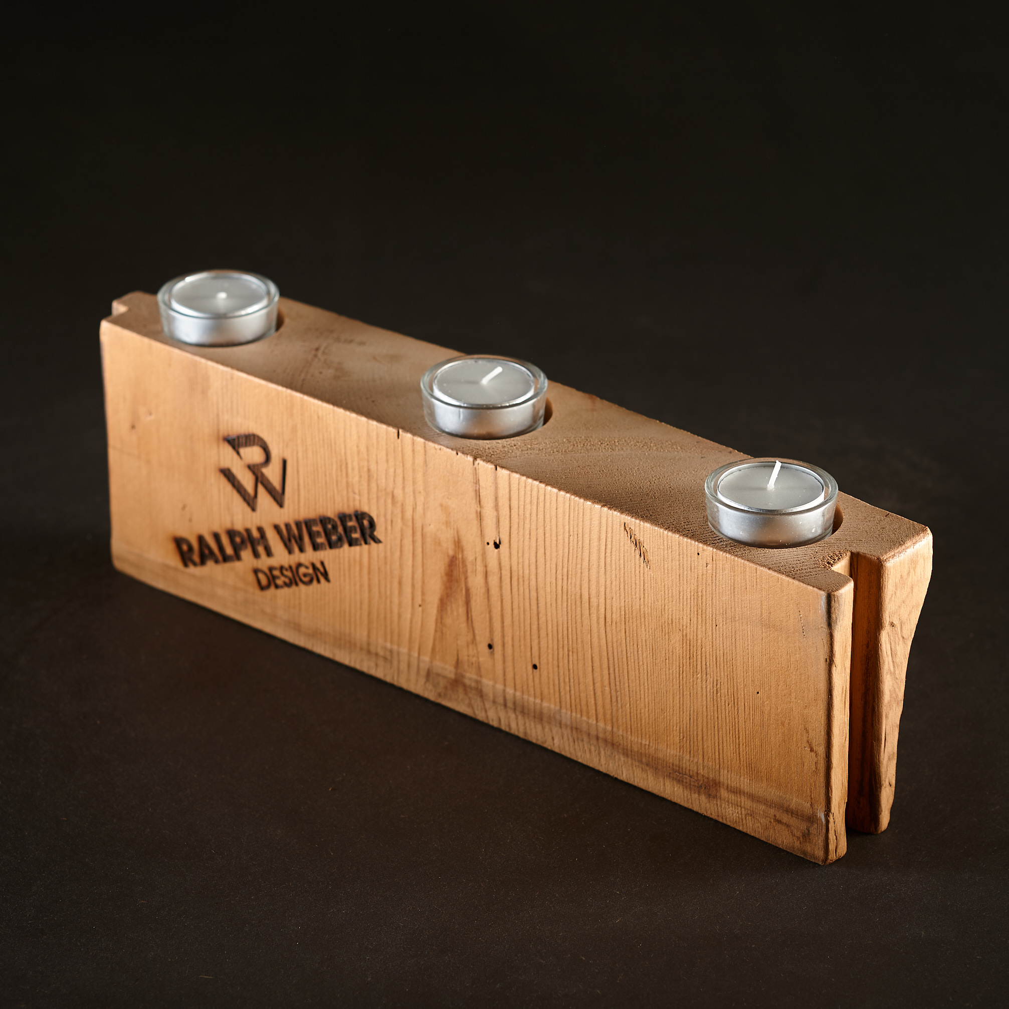 Holzblock “Arva-Kerza” aus altem Arvenholz. Holz von alten Bodenbrettern. Rustikal gebürstet. 3 Lochbohrungen für Rechaudkerzen. Sieht rustikal-nobel-heimelig aus. Jeder Holzblock ist ein Unikat. Gerne lasern wir auch Ihren persönlichen Spruch oder ein Sujet ein. Länge ca. 30-40 cm, Höhe ca. 10 cm, Dicke ca. 4-6 cm