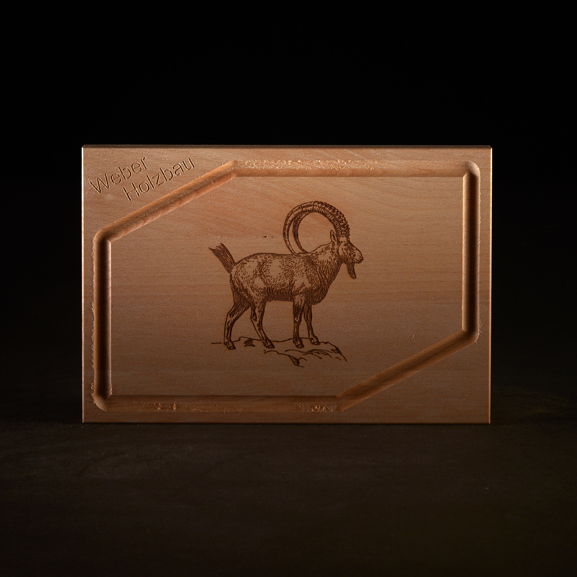 Holzbrett “Steinbock” mit Saftrille. Brett Buche massiv, 1-seitig Saftrille, seitlich 2 Griffmulden, Brett auf beiden Seiten verwendbar. Steinbock eingelasert. Geölt. Grösse L x B x H: 29.5 x 20 x 2.6 cm