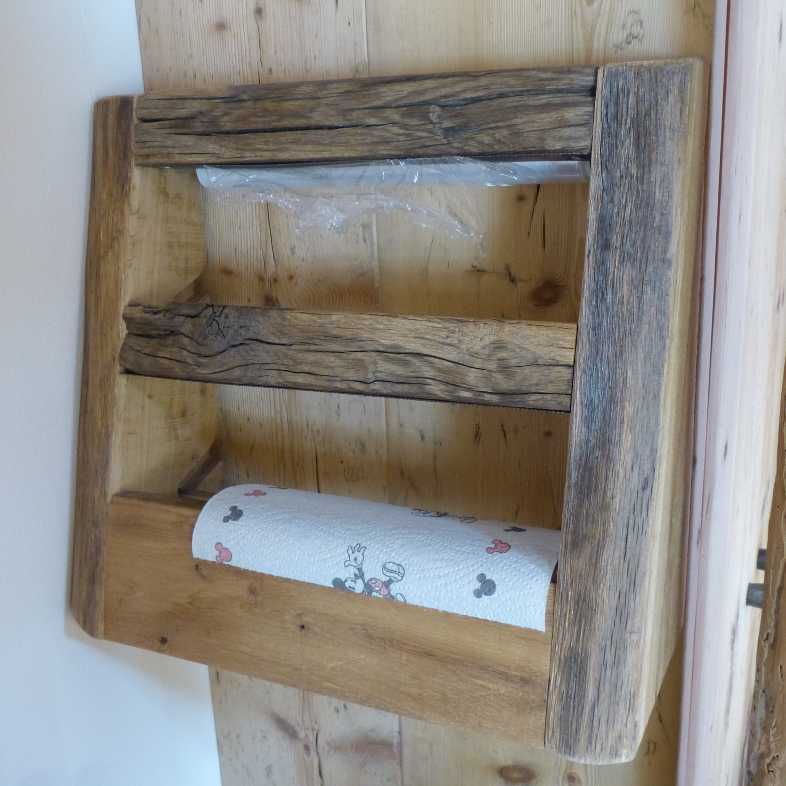 Haushaltsrollenhalter “Flurina” in Altholz Eiche, rustikal gebürstet. Rollenhalter (Alufolie, Klarsichtfolie, Handtuchrolle) in Chromstahl, Durchmesser 1.5 cm, altes Sägeblatt von Absetzsäge zum Abreissen. Mit 2 Schlupflöcher zum Aufhängen. Rollenhalter kann auch auf Tisch gestellt werden. Grösse B x T x H: 45.5 x 7.5-18.5 x 40 cm