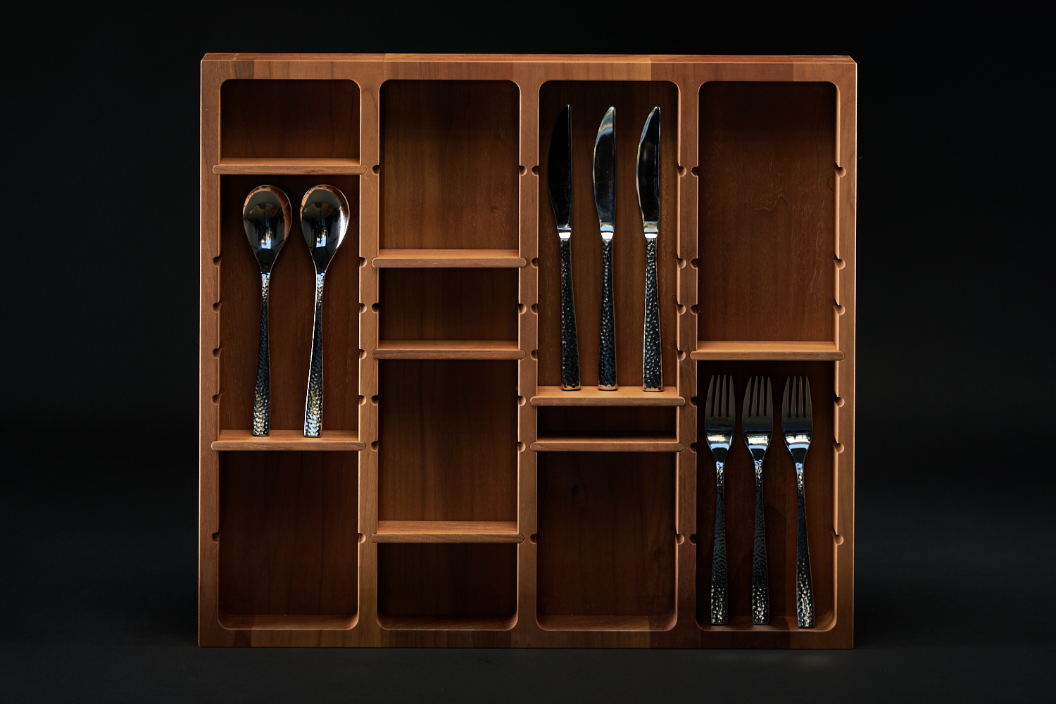Besteckeinsatz “Nobla-Sorta” Eiche aus einem Massivholzbrett. Fächer für Besteck und Kochutensilien ausgefräst. Lackiert. Erhältlich in den Holzarten Nussbaum, Eiche, Buche und Fichte. Andere Holzarten auf Anfrage. Grösse H x B x L: 5 x 55.4 x 51.8 cm. - Andere Grössen bis 60 x 60 cm Zuschlag von 50.00 Fr./Stück