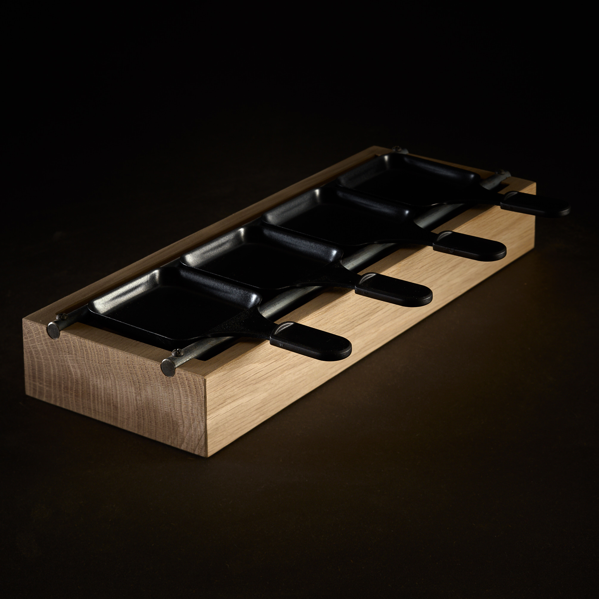Holz-Raclette 4er “Quattro”, Holz geölt, Holzklotz mit 2 Eisenstangen für 4 Raclettepfännli, inkl. 4 Raclettepfännli, 16 Gläsli inkl. Rechaudkerzli, ideal für ein gemütliches und romantisches Raclette Zuhause oder im Freien mit Freunden und Familie. Wegen Vertiefung der Gläsli/Kerzli auch bei Wind brauchbar. Erhältlich in den Holzarten (geölt) Eiche und Lärche. Andere Holzarten auf Anfrage. Grösse L x B: 44 x16 cm