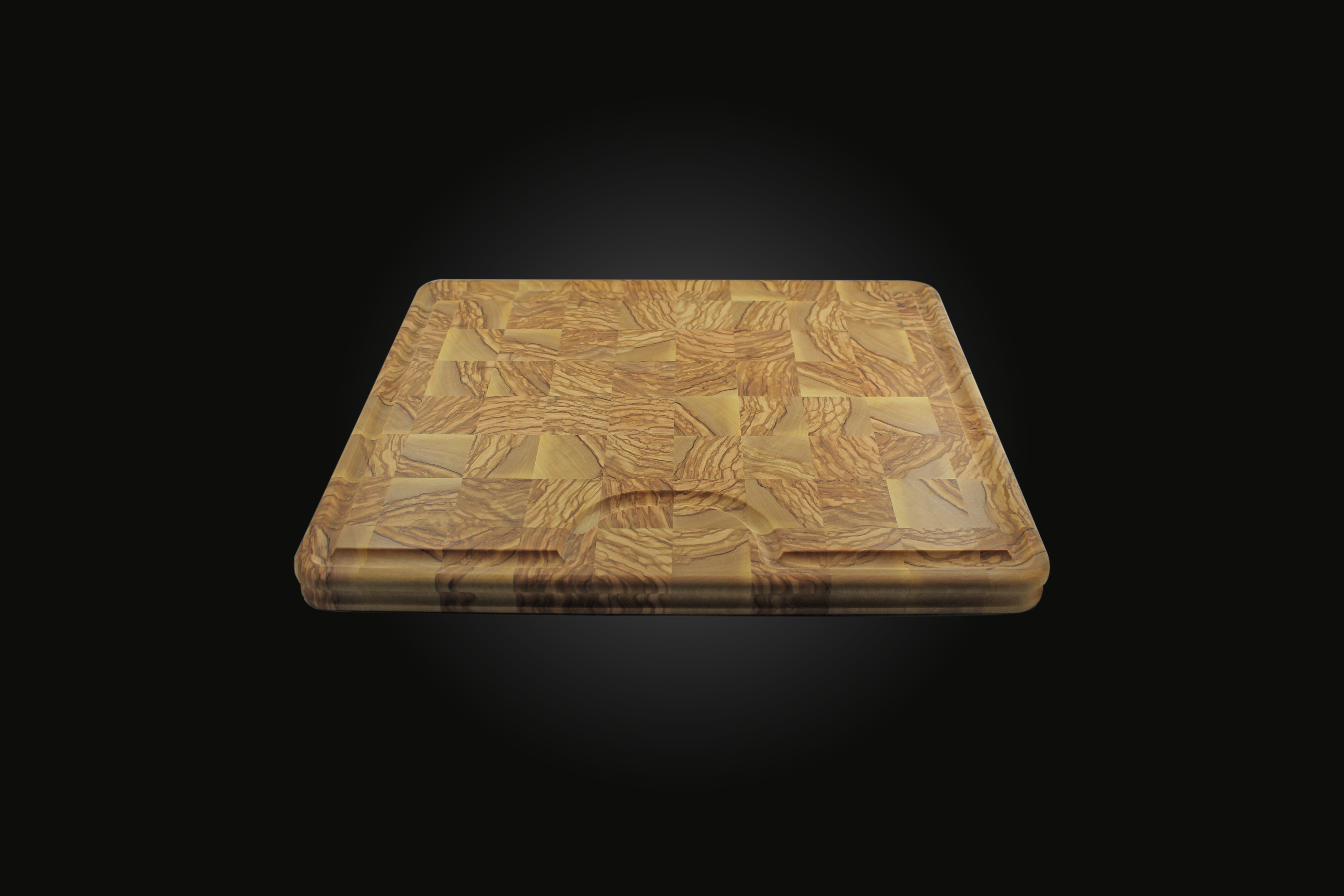Oberseite mit umlaufender Saftrille und Saftauffang, untere Seite glatt. Griffrundung für gutes Greifen, runde Ecken Olivenholz massiv, verleimt mit Hirnholzklötzli, schöne Maserung, geölt mit Komplex-Hartöl Grösse L x B x H: 39.5 x 31.5 x 2.6 cm