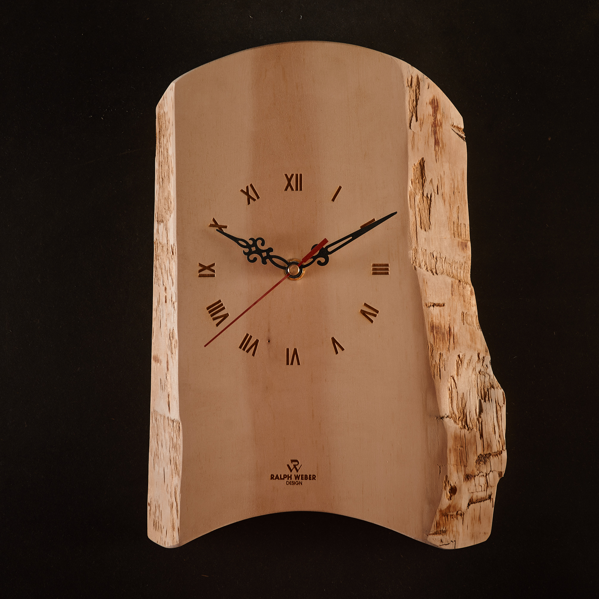 Uhr “Alpen Chic” aus Bündner/Engadiner Arve. Mit Baumkanten. Zifferblatt gelasert mit römischen Zeichen. Flüsterleises, schleichendes Uhrwerk mit 3 Zeiger. Auf Rückseite Schlupfloch zum Aufhängen. Jede Uhr ist ein Unikat, farbliche Abweichungen und Grössen sind möglich. Grösse L x B x H: ca. 33 x 22 x 2.5 cm