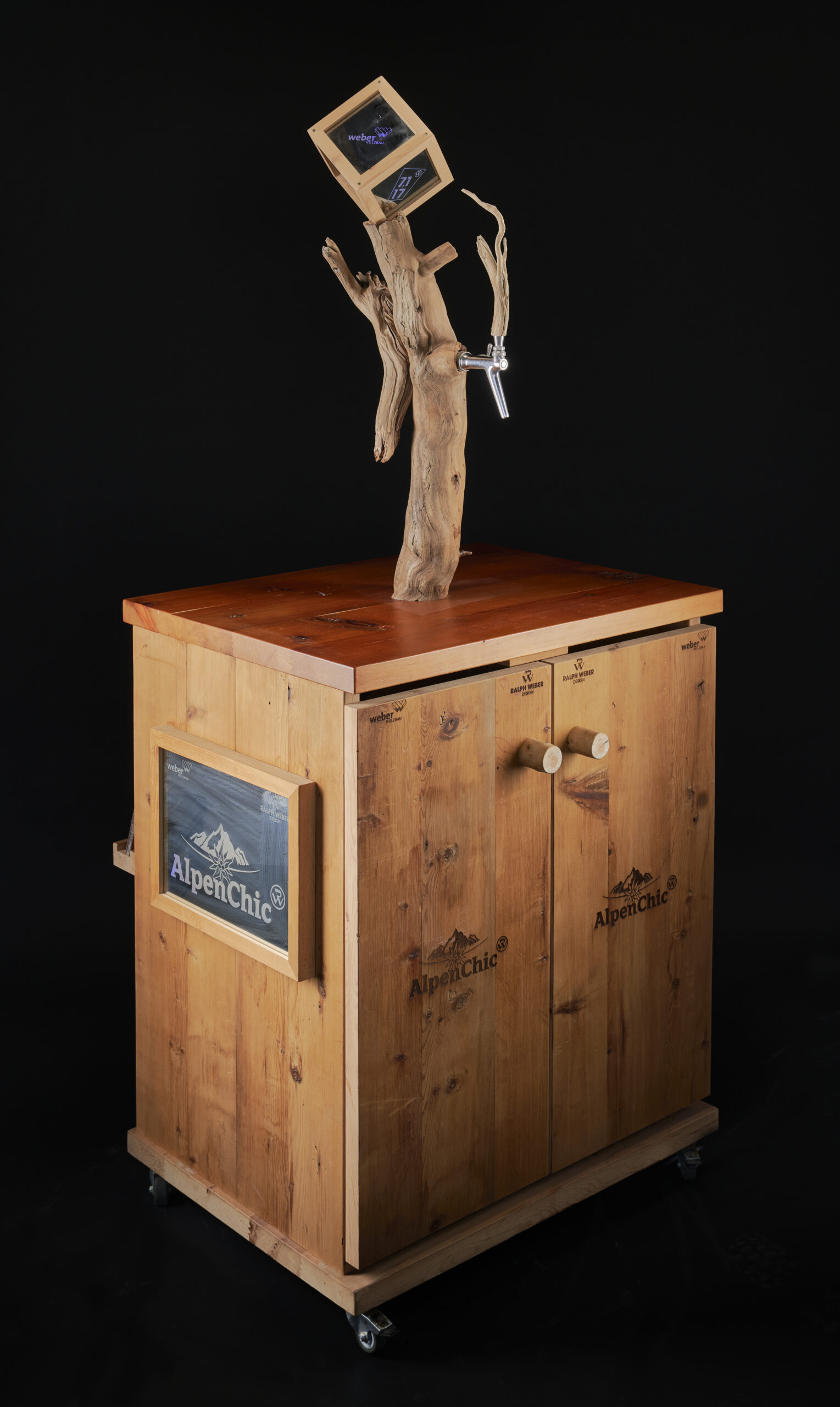 Bierwägeli “Birra” mit 4 Räder, 2 Türli, LED-Beleuchtung, Musikanlage mit 2 Boxen, Zapfanlage mit Durchlaufkühler, Kohlensäure, Zapfhahn aus Savogniner-Fundholz Grösse L x B x H: 80 x 60 x 101/188 cm Miete auf Anfrage