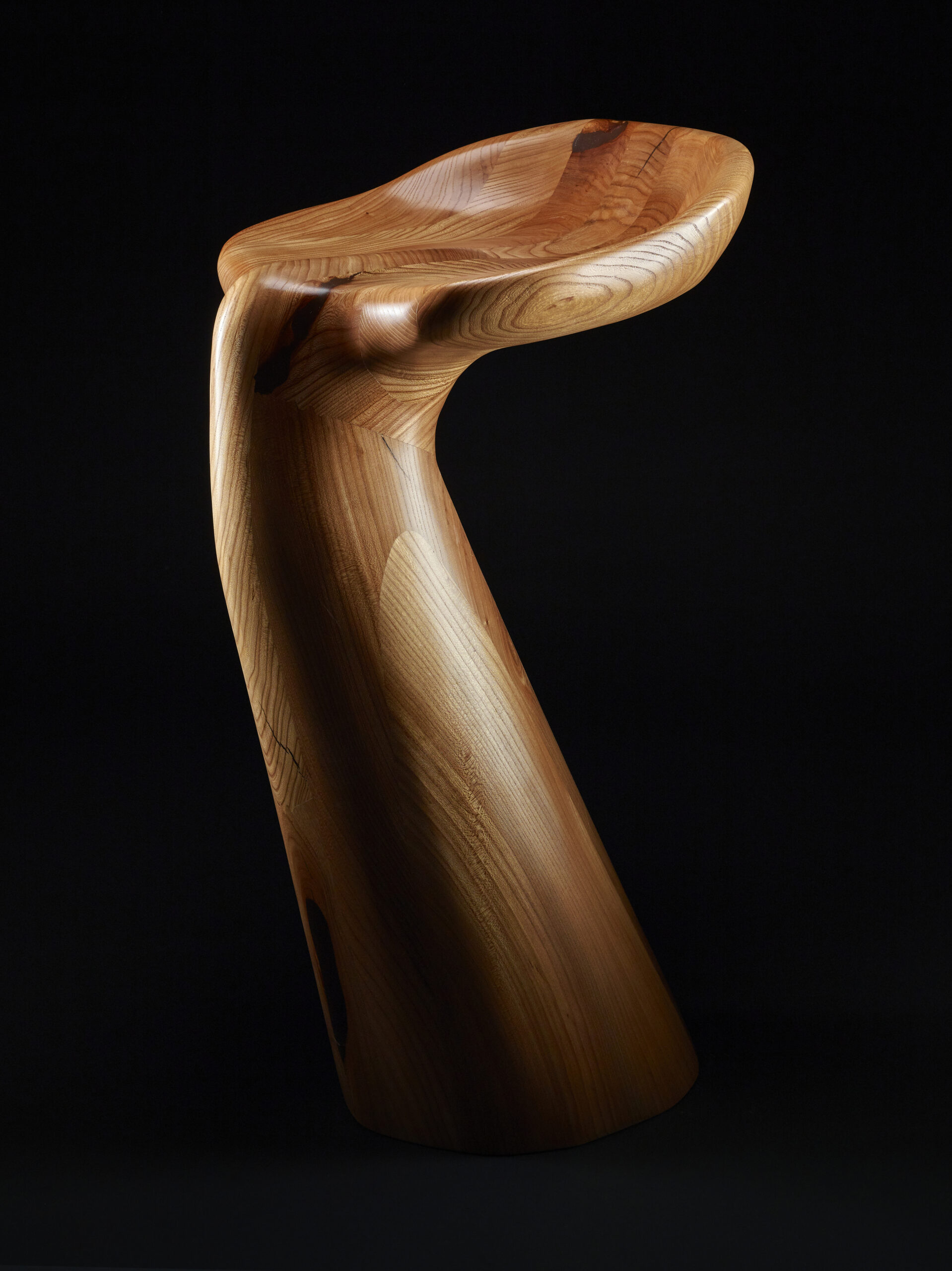 Barstuhl “Hand” aus Ulmenholz. Der Stuhl hat die Form wie eine Hand. Man hat das Gefühl, dass man von einer Hand getragen wird. Holz wurde verleimt. Mit der Motorsäge, Schleifscheiben und viel Handarbeit wurde der Stuhl hergestellt. Der Stuhl ist seidenmatt lackiert. Sitzhöhe 80 cm / Breite 54 cm / Tiefe 42 cm Gesamthöhe 90 cm Barstuhl "Hand" Menge