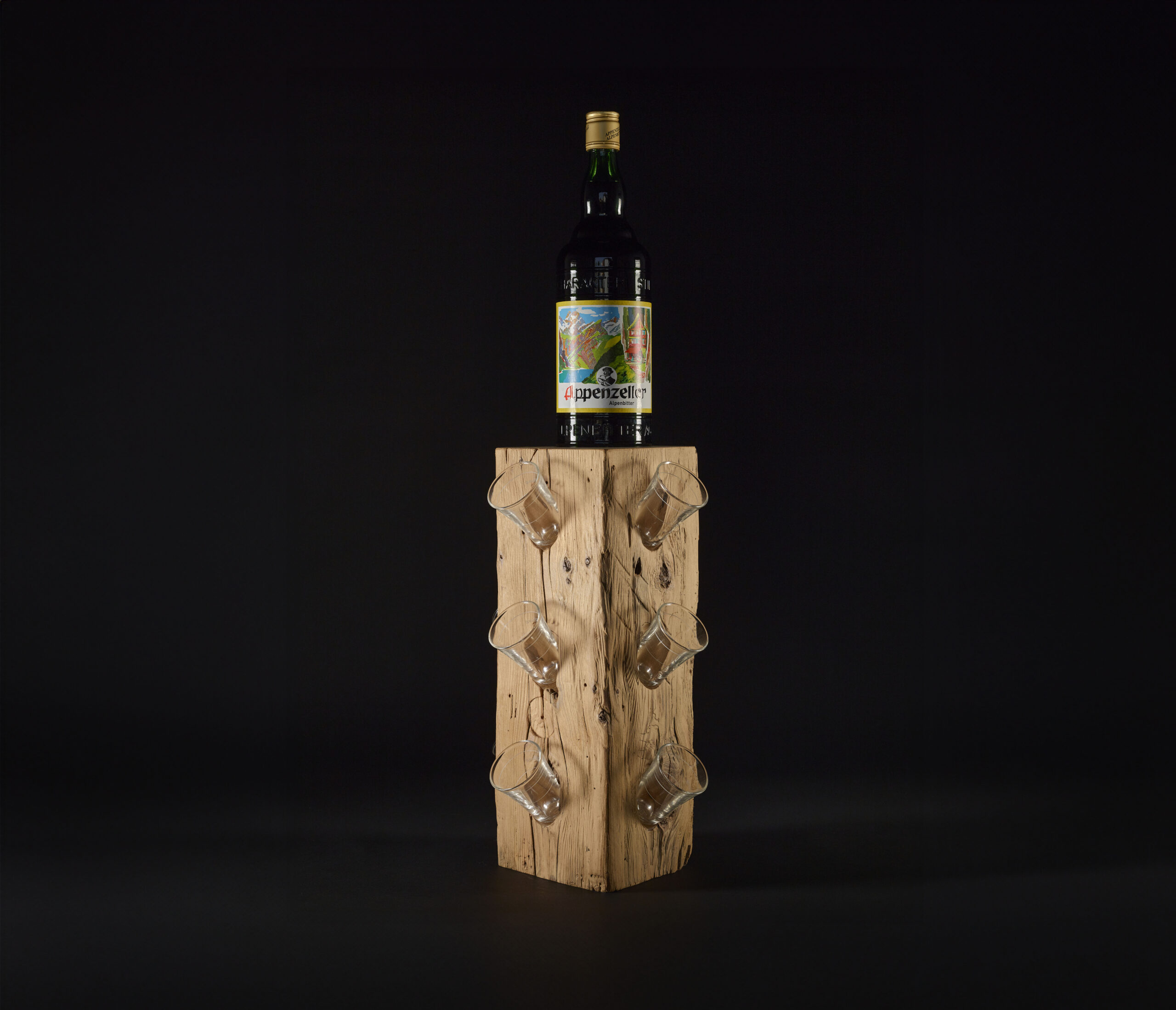 Holzsäule-Likör 1 Lochbohrung oben für eine Flasche mit Durchmesser 8.5 cm 4x je 3 Ausfräsungen pro Seite für Shot-Gläser Dublino 5.7 cl, 12 Gläser sind optional käuflich Grösse L x B x H: 54 x 37 x 40 cm