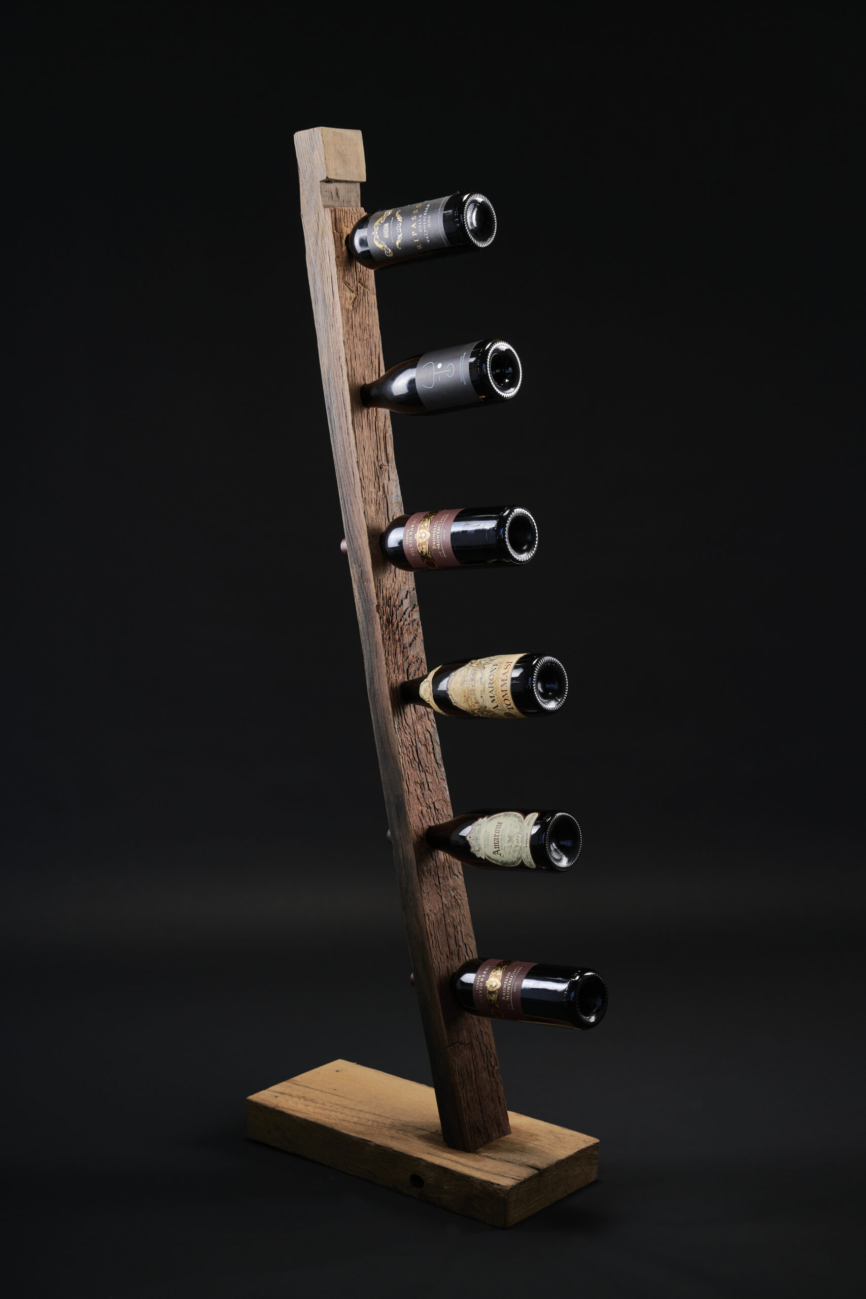 Weinständer aus einer Fassdaube von einem alten Eichen-Weinfass 6 Bohrungen mit einem Durchmesser von 3 cm für Weinflaschen Sockel aus Altholz Eiche Der Weinständer ist ein Unikat und eine Einzelanfertigung. Höhe 141 cm / Sockel 47.5 x 20 x 5.5 cm
