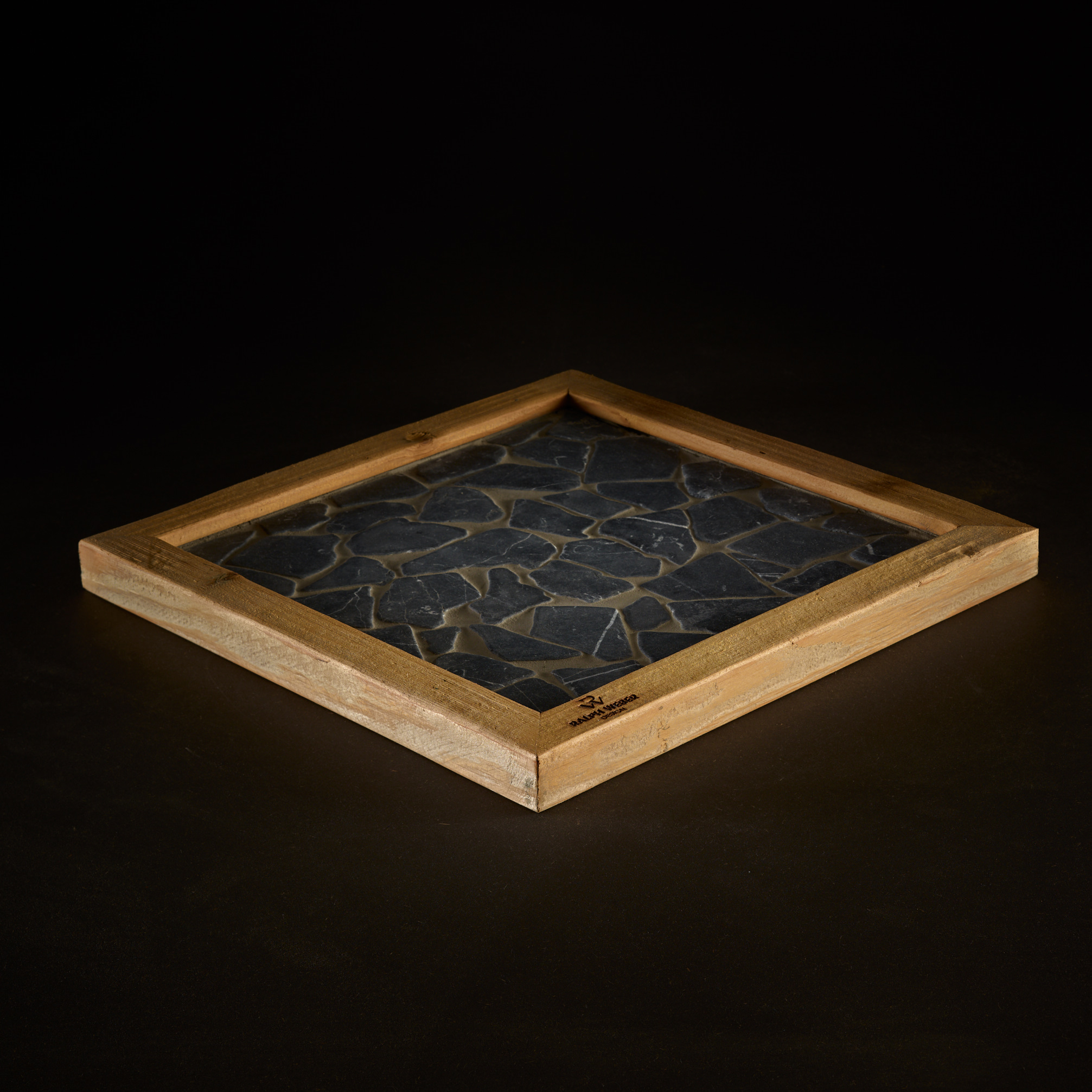 Genussbrett “Schieferi-Holz”, Brett mit wählbar Natursteinen oder Plättlimuster. Holzrahmen Altholz gegehrt, rustikal gebürstet. Geölt. Ideal zum Anrichten und Servieren. Grösse L x B x H: 35 x 35 x 2.8 cm