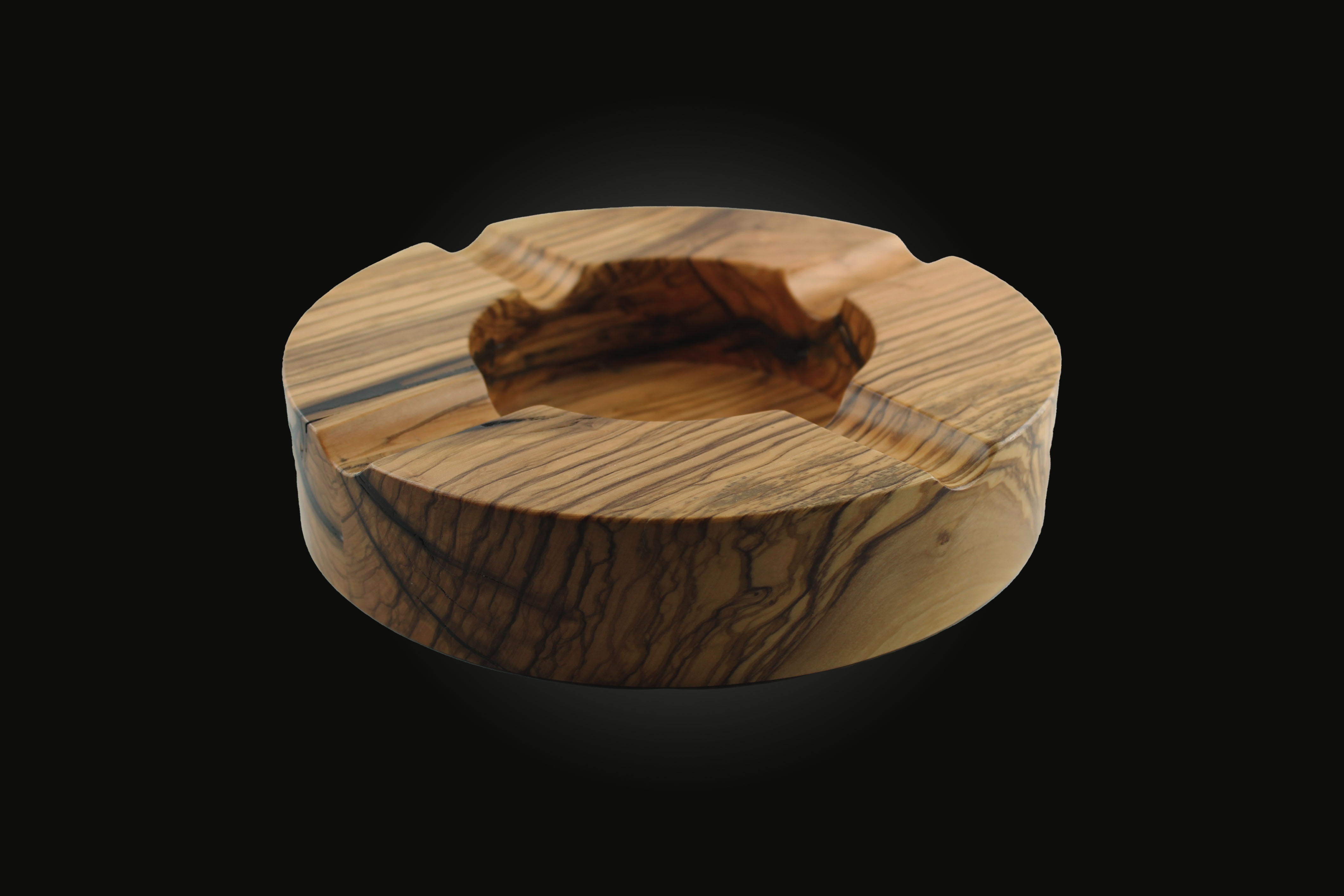 Aschenbecher “Zigarondo” Nussbaum oder Olivenbaum, lackiert, rund, für 4 Zigarren. Jeder Aschenbecher ist ein Unikat, farbliche Abweichungen sind möglich. Grösse: Durchmesser 21 cm, Höhe 4 cm