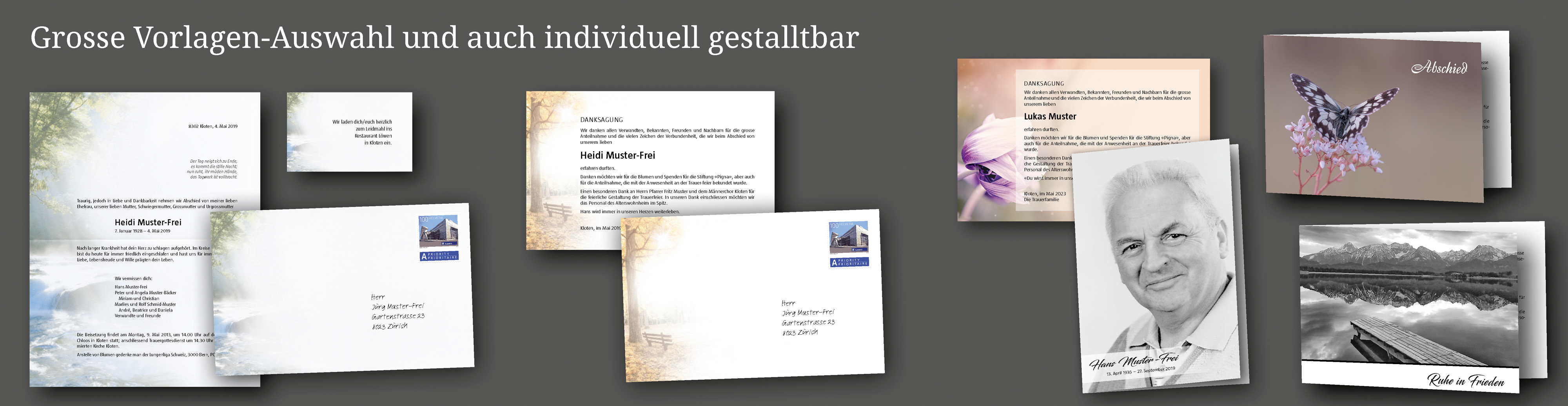 Auf unserer Internetseite können Sie in aller Ruhe, ohne dass Sie an Geschäftsöffnungszeiten gebunden sind, Trauerkarten, Leidmahlkarten und Danksagungskarten aussuchen und bestellen. Hier finden Sie Anregungen für die Gestaltung, Textformulierungen und Hinweise über die wichtigsten Inhalte. Diese sollen Ihnen die Schreibarbeiten erleichtern und sicherstellen, dass nichts und niemand bei der Benachrichtigung und beim anschliessenden Danken vergessen wird. Die Erfahrung hat gezeigt, dass sich in der Hektik Schreibfehler einschleichen können und jede Trauerkarte je nach Textmenge, Art des Textes, Kartensujet usw. eine individuelle Gestaltung benötigt. Unsere erfahrenen Kundenberater helfen Ihnen gerne bezüglich Text und der Auswahl einer passenden Karte und stehen Ihnen persönlich zur Seite, wo Sie Unterstützung brauchen. Todesanzeigen und Danksagungen für die meisten Schweizer Zeitungen nehmen wir für Sie entgegen und leiten sie weiter. TRAUERKARTEN Mit den Leidzirkularen insbesondere der Trauerkarte und Todesanzeige werden Verwandte, Bekannte und Freunde persönlich über den Tod eines lieben Angehörigen informiert und zum Abdankungsgottesdienst sowie zur Beisetzung eingeladen. Unter folgendem Link finden Sie eine Wegleitung, die Ihnen das Zusammenstellen des Textes für die Trauerkarten erleichtern soll: Wegleitung und Textbeispiele Trauerkarten Eine Auswahl an Sinnsprüchen und Gedichten finden Sie unter folgendem Link: Sprüche & VerseSollten Sie ein eigenes Sujet oder eine individuelle Karte wünschen, nehmen Sie bitte mit uns Kontakt auf oder beschreiben Sie Ihren Gestaltungs- oder Schriftwunsch am Schluss der Bestellung unter Bemerkungen.>>> Weiter zur Bestellung / Sujetauswahl DANKSAGUNGEN Auf die Trauerkarten, die als persönliche Information an Verwandte, Bekannte und Freunde verschickt wurden, folgt in der Regel eine Danksagung. Diese erhalten in erster Linie all jene, die entweder gespendet oder Blumen haben zukommen lassen, aber auch alle, die ihre Anteilnahme bekundet haben und dem/der Verstorbenen beim Abschied beigestanden sind (Pflegepersonal, Ärzte, Pfarrer usw.). Unter folgendem Link finden Sie eine Wegleitung, die Ihnen das Zusammenstellen des Textes der Danksagung erleichtern soll: Wegleitung & Textbeispiele Danksagung Wir können Ihnen zwei Kartenvarianten anbieten. Die Einfachkarte oder die Doppelkarte (auch für viel Text). Sollten Sie ein eigenes Sujet oder eine individuelle Karte wünschen, nehmen Sie bitte mit uns Kontakt auf oder beschreiben Sie Ihren Gestaltungs- oder Schriftwunsch am Schluss der Bestellung unter Bemerkungen. >>> Weiter zur Bestellung / Sujetauswahl ZUSATZLEISTUNGEN Adresse auf Kuverts aufdrucken Auf Wunsch drucken wir ab gelieferter Adressdatei (Excel-Datei) die Adressen auf die Kuverts. Wenn Sie dies wünschen, können Sie es bei der Bestellung angeben. Die genauen Kosten werden Ihnen bei der Eingabe der Bestellung angezeigt. Karten in Kuverts einpacken, frankieren und Postaufgabe Auf Wunsch verpacken wir die Karten in die Kuverts, frankieren sie mit Briefmarken und organisieren den Postversand. Wenn Sie dies wünschen, können Sie es bei der Bestellung angeben. Die genauen Kosten werden Ihnen bei der Eingabe der Bestellung angezeigt. Briefmarken Sie können bei uns auch Briefmarken bestellen (gilt nur im Zusammenhang mit einer Trauerkarten-/ Danksagungskarten-Bestellung). So können Sie zu Hause alles fertigstellen und müssen die Kuverts auf der Post nur noch abgeben. Wenn Sie dies wünschen, können Sie es bei der Bestellung angeben. LIEFERFRISTEN Da Trauerdrucksachen in der Regel sehr eilen, haben diese bei uns oberste Priorität. Bestellungen werden laufend abgerufen. Einen Probeabzug für Sie zur Kontrolle erstellen wir in der Regel innert 1 bis 2 Stunden (während den Geschäftsöffnungszeiten: Mo–Fr, 8–12 Uhr / 13.30–17 Uhr). Nach Erhalt Ihrer Erteilung des «Gut zum Druck» werden die Drucksachen innert 1 bis 2 Stunden produziert und für den Versand oder die Abholung bereitgestellt. In der Regel laufen die Bestellungen wie folgt ab: Bestelleingang bis ca. 14 Uhr – Postaufgabe bis 18 Uhr – bei Ihnen am Folgetag zwischen 7 und 9 Uhr. Bitte haben Sie Verständnis dafür, dass wir nur in die Schweiz und nach Liechtenstein liefern.