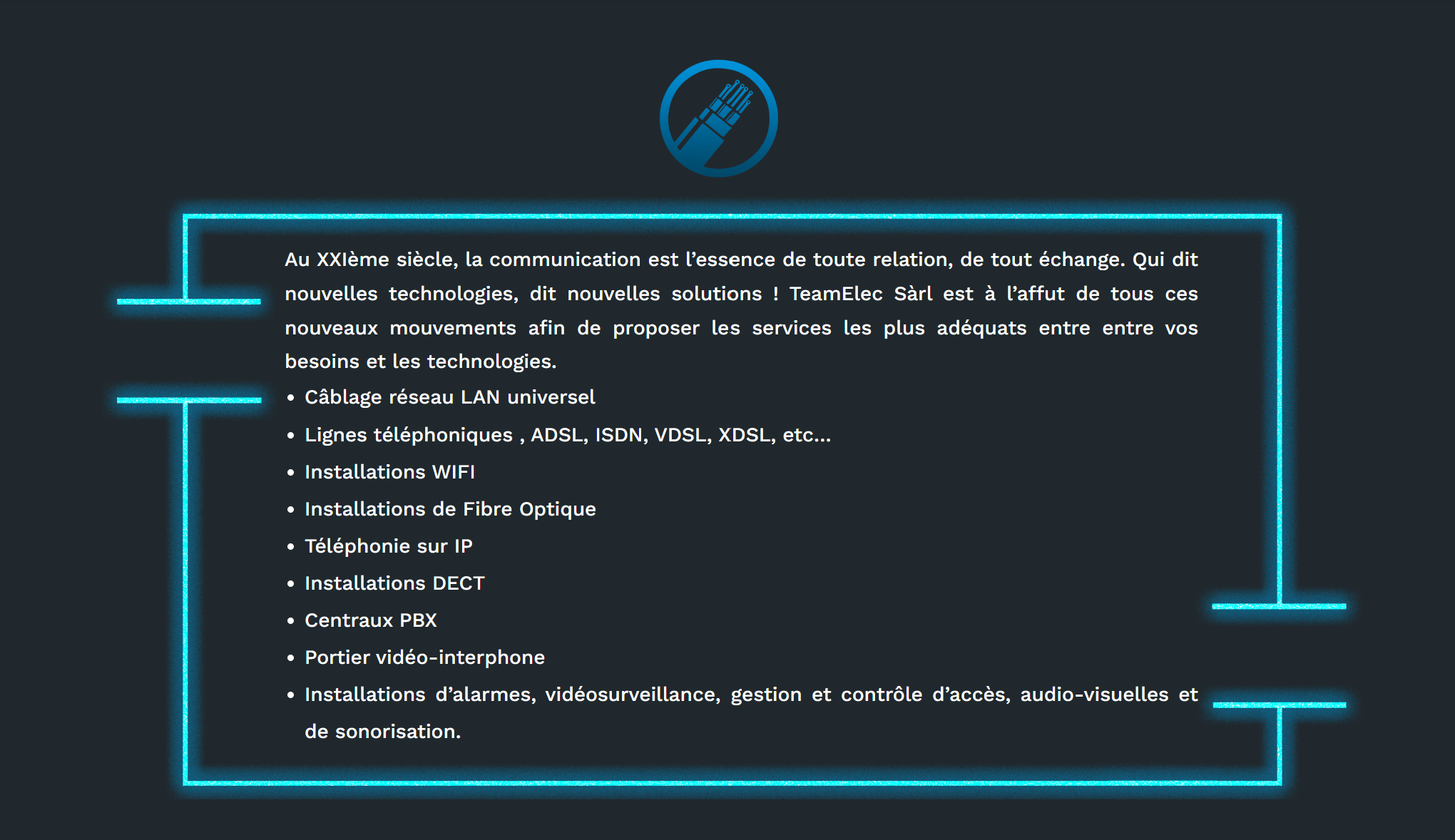 Constamment en expansion, le domaine de l’élecricité concerne tout un chacun au quotidien. Chez TeamElec S.à.r.l. nous mettons en avant notre expérience afin d’innover dans nos projets, d’apporter des solutions adaptées à chaque personne et pour chaque projet. Présente depuis plus de 20 anssur sol genevois, notre équipe est composée de techniciens, d’ouvriers et de partenaires passionnés et altruistes qui apportent, à chaque client, leurs expériences, leur maîtrise et leur savoir-faire qui font notre force depuis tant d’années. Miguel CONSTANTINO