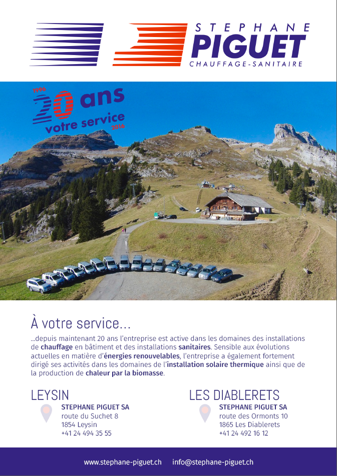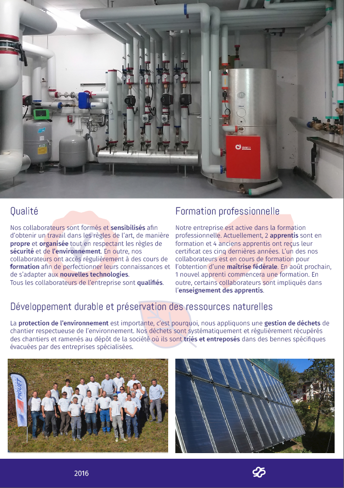 24 Jahre ... jetzt ist das Unternehmen in den Bereichen Heizung und Gebäude sanitäre Anlagen aktiv. Empfindlich auf die aktuellen Entwicklungen im Bereich der erneuerbaren Energien, auch das Unternehmen gerichtet stark seine Aktivitäten in den Bereichen Solaranlage und der Wärmeerzeugung aus Biomasse. Unsere Mitarbeiter sind geschult und sensibilisiert, um einen Job in der Stand der Technik, sauber und organisiert Art und Weise zu bekommen, während die Regeln der Sicherheit und del'environnement respektieren. Darüber hinaus haben unsere Mitarbeiter regelmäßig Zugang zu Verformung Kurse ihre Fähigkeiten zu verbessern und an neue Technologien anzupassen. Alle Mitarbeiter des Unternehmens sind qualifiziert. Unser Unternehmen ist aktiv in der Berufsausbildung. Derzeit sind zwei Lehrlinge in Ausbildung und vier ehemalige Auszubildende erhielten ihre Zertifikate letzten fünf Jahre. Der Umweltschutz ist wichtig, so wenden wir einen respektvollen Ort der Abfallwirtschaft der Umwelt. Unsere Abfälle werden systematisch und regelmäßig Yards und brachte auf die Einreichung des Unternehmens gesammelt, wo sie in bestimmten Behältern entfernt von spezialisierten Unternehmen werden sortiert und gespeichert. LEYSIN route du Suchet 8 1854 Leysin +41 24 494 35 55 LES DIABLERETS route des Ormonts 10 1865 Les Diablerets +41 24 492 16 12