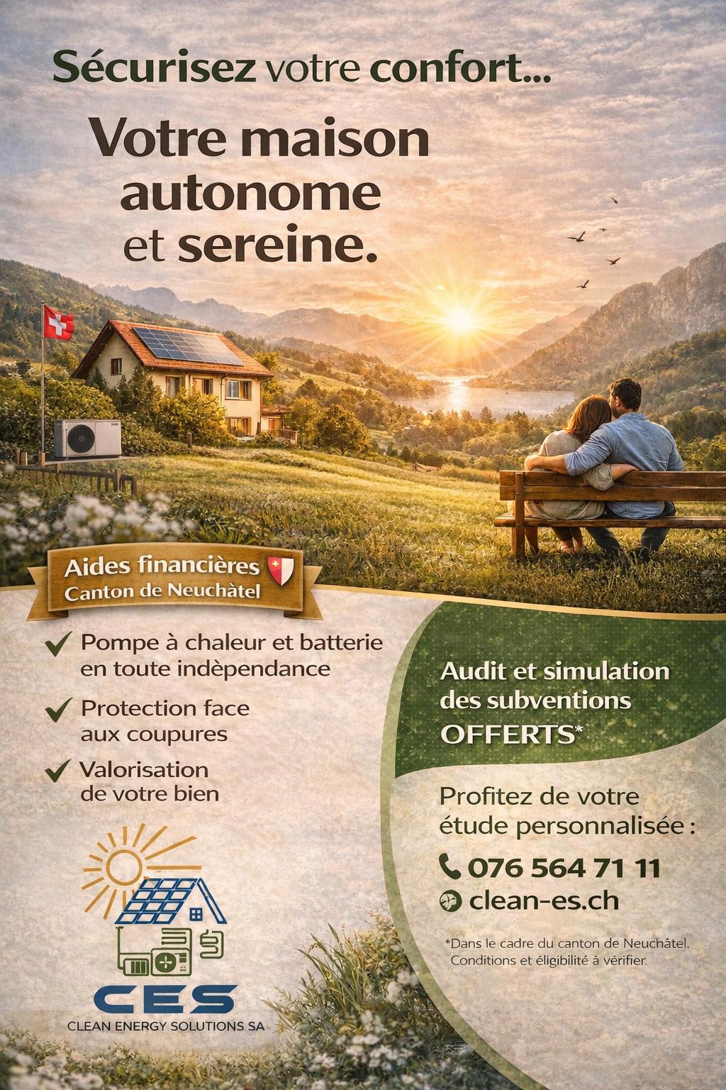 Clean Energy Solutions SA est spécialisée dans les solutions énergétiques durables en Suisse romande. Nous accompagnons particuliers et professionnels dans leurs projets de rénovation énergétique avec des installations sur mesure en photovoltaïque, pompes à chaleur, isolation périphérique, batteries de stockage et bornes de recharge pour véhicules électriques. Notre expertise permet d’optimiser la consommation énergétique, d’améliorer l’autoconsommation solaire et de réduire durablement les coûts d’électricité et de chauffage. Nous proposons des solutions complètes, fiables et innovantes pour une énergie plus économique, écologique et sécurisée. Basés à Neuchâtel, nous intervenons dans toute la Suisse romande pour offrir un accompagnement personnalisé, de l’étude à la mise en service.