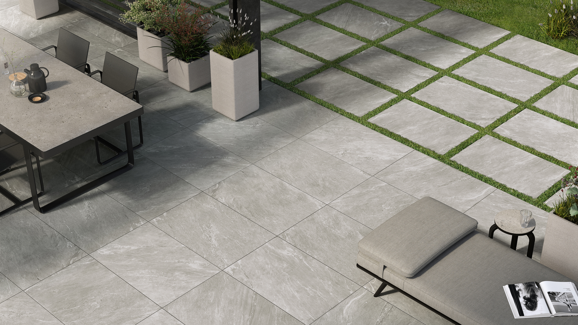 Feinsteinzeugplatten in 20 mm Stärke sind ein äusserst aktuelles und zweckmässiges Produkt für jeden Bodentyp im Aussenbereich und haben gegenüber herkömmlichen Aussenplatten bedeutende Vorteile: - Frostbeständig, keine Frostschäden im Vergleich zu Festverklebung, Salz- und Säurebeständig - Fleckenunempfindlich, kein Wasser von unten nachziehend, keine Wasserflecken - Hohe Rutschfestigkeit (R11) - Kratz- und Bruchfest, Bruchlast über 1000 kg / Platte, Hochdruckreinigung geeignet - Pflegefreundlich, keine Imprägnierung, keine Algen- und Moosbildung - Farbbeständig, keine farblichen Veränderungen Mögliche Verlegearten: - In losen Splitt mit Fugenkreuz (Oberfläche im Blei oder im Gefälle) - In Gras oder Sand - Auf Splittbeton (Trasszement) verkleben mit offenen Fugen - Auf Stelzlager Diese Aussenplatten sind in den diversen Optiken erhältlich: Naturstein-, Holz- und Betonoptik, wählen Sie aus einer Vielfalt von Farben und Formaten. Viele Serien aus unserer Ausstellung sind ebenfalls in 10mm Stärke für den Innenbereich erhältlich, sodass der Wohnraum optisch vergrössert werden (IN & OUT System).