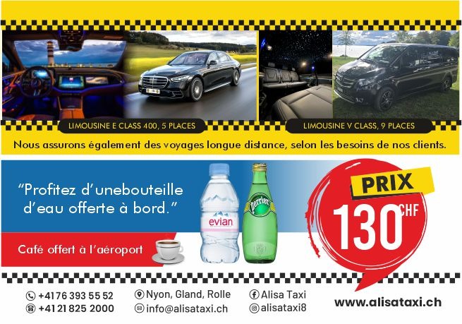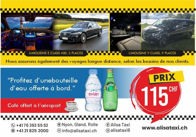 Alisa Taxi & Limousines – Ihr Partner für erstklassigen Transport Entdecken Sie einen Taxi- und Limousinenservice, der Eleganz, Komfort und Zuverlässigkeit vereint. Ob Flughafentransfer, Hochzeit, private Feier oder Geschäftsreise – unsere professionellen Chauffeure garantieren Pünktlichkeit, Diskretion und ein VIP-Erlebnis. Mit einer Flotte von Prestigefahrzeugen und einem 24/7-Service begleitet Sie Alisa Taxi & Limousines auf allen Fahrten, in der Schweiz und international. Reisen Sie entspannt und genießen Sie einen exklusiven Transport, der auf Ihre Bedürfnisse zugeschnitten ist. Unsere Fahrzeugflotte umfasst: - Mercedes-Benz S-Klasse – der Inbegriff von Komfort und Raffinesse. - Mercedes-Benz V-Klasse (VIP Van) – ideal für Gruppen bis zu 8 Personen und Geschäftsreisen. - Mercedes-Benz E-Klasse – Eleganz und Leistung für tägliche oder berufliche Fahrten.