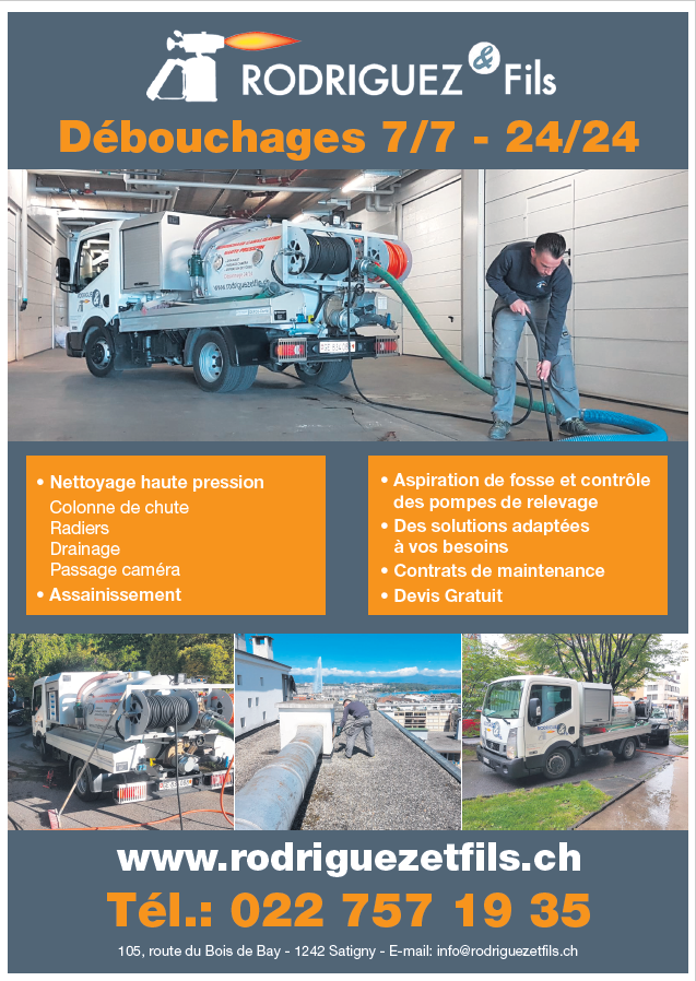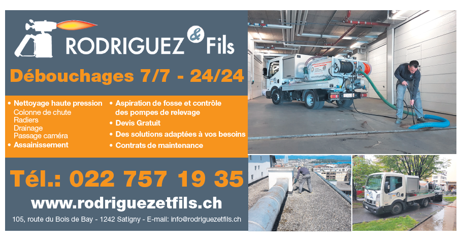 L’entreprise Rodrigez & Fils vous accompagne et vous conseille dans tous les projets de construction, rénovation ou transformation de votre habitation. Fondée le 1er avril 2000 par Jaime et Sébastian Rodriguez, elle s’est développée rapidement grâce au dynamisme de ces deux entrepreneurs décidés. Ainsi, après seulement quelques années, elle gérait déjà d’importants chantiers demandant une gestion impeccable des plannings et un grand savoir-faire, en particulier pour certaines réalisations de très grand standing. De nouveau services Au fil des ans, de nouveaux services virent le jour, en partie pour répondre au mieux à la demande, comme par exemple un service spécial pour les régies (maintenance d’immeubles 24 h. sur 24), un service de drainage et de nettoyage de canalisations, ou encore le dépannage 24 h/24 et 7 jours / 7, notre produit phare! Un savoir-faire multi-carte Nos compétences couvre les domaines suivants: - Bureau d'ètudes - Installations Saniataires - Rénovation - Gros chantiers - Installations gaz – tous raccordements - Pompes de relevage, maintenance - Installation d’adoucisseurs d’eau - Dépannage urgent 7 jours sur 7 - Nettoyage haute pression / Débouchages