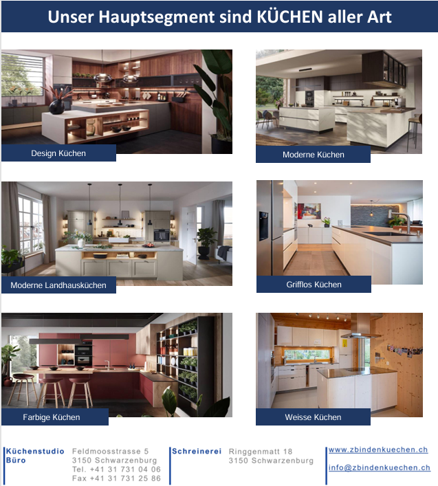 Die Küche ist der Ort in der Wohnung oder im Haus, wo man sich trifft, wo es lebendig und gemütlich ist. Vielleicht haben Sie zwei Bäder, zwei Schlafzimmer oder zwei Arbeitszimmer – aber die Küche gibt es nur einmal. Wir sind Küchenbauer aus Leidenschaft, wir legen Wert auf persönliche, kompetente und ehrliche Beratung. Damit Sie auch in vielen Jahren noch glücklich mit Ihrer Küche sind. Seit 1992 plant und baut unsere Schreinerei Küchen, Badmöbel und Wohnmäbel. Unsere Küchenausstellung haben wir 2010 eröffnet, dort können Sie fünf Küchen und eine Badezimmereinrichtung sehen, begehen und ausprobieren. Sie finden dort ausserdem unsere Musterpräsentationen für Möbelfronten, Granit, Glas, Chromstahl, Holz, Parkett und vieles andere mehr. Lassen Sie sich inspirieren! Konstruieren, bauen, anrichten - Massanfertigungen: Wir bauen Ihnen individuelle Möbel für Küche, Bad und andere Räume. - Böden: Wir verlegen Parkett, Laminat, Teppich, Linoleum u. v. a. - Montage: Wir montieren die bei uns bestellten Küchen / Landhausküchen. - Reparaturen: Wir führen Holzreparaturen aller Art aus. - Geräteauslieferung: Wir liefern Ihnen Elektrogeräte für Küche, Waschküche und Weinkeller. - Geräteaustausch: Sollte eines der Elektrogeräte in Ihrer Küche defekt sein, entsorgen wir das alte fachgerecht und bauen Ihnen Ihr neues Wunschgerät ein - Ausmessen Ihrer Küche (oder Ihres Bades) und intensive Beratung vor Ort und in unserer Ausstellung über Gestaltungsmöglichkeiten und Geräteausstattung - Beratung zu Farb- und Wohnkonzepten für Ihre Wände und Böden in Küche und Bad - Erstellung einer kostenlosen aussagekräftigen Offerte mit Perspektive und Grundrissplan und der Vorführung Ihrer neuen Küche an unserem grossen Bildschirm in 3D- Animation - Erstellen von exakt ausgearbeiteten Ausführungsplänen - Enge Zusammenarbeit mit allen bekannten Lieferanten hochwertiger Geräte und Zubehör für Küche und Bad