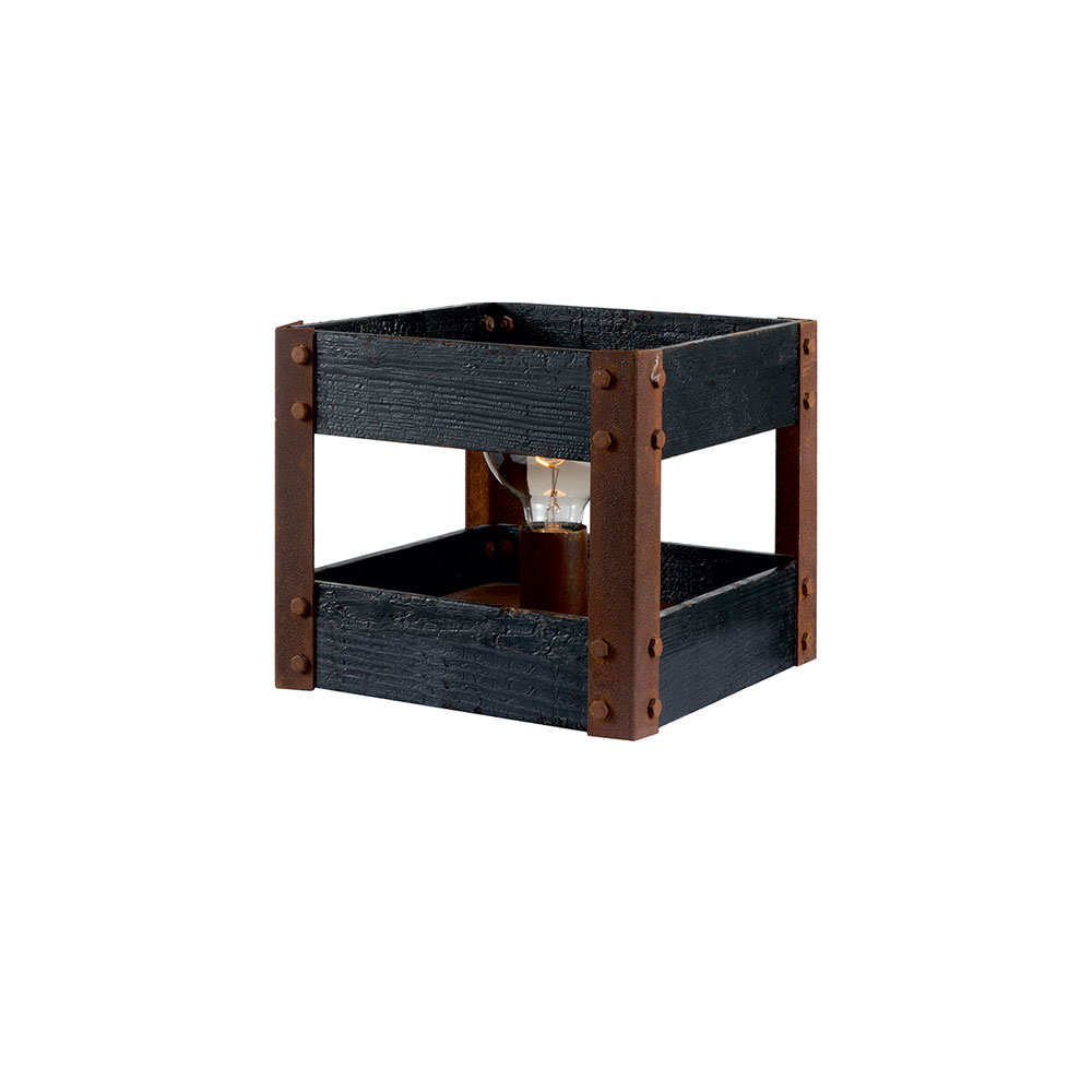 Trendige Tischleuchte aus rostigem Metall und verbranntem Holz Pinewood mit Zertifikat FSC (Made in Finland)