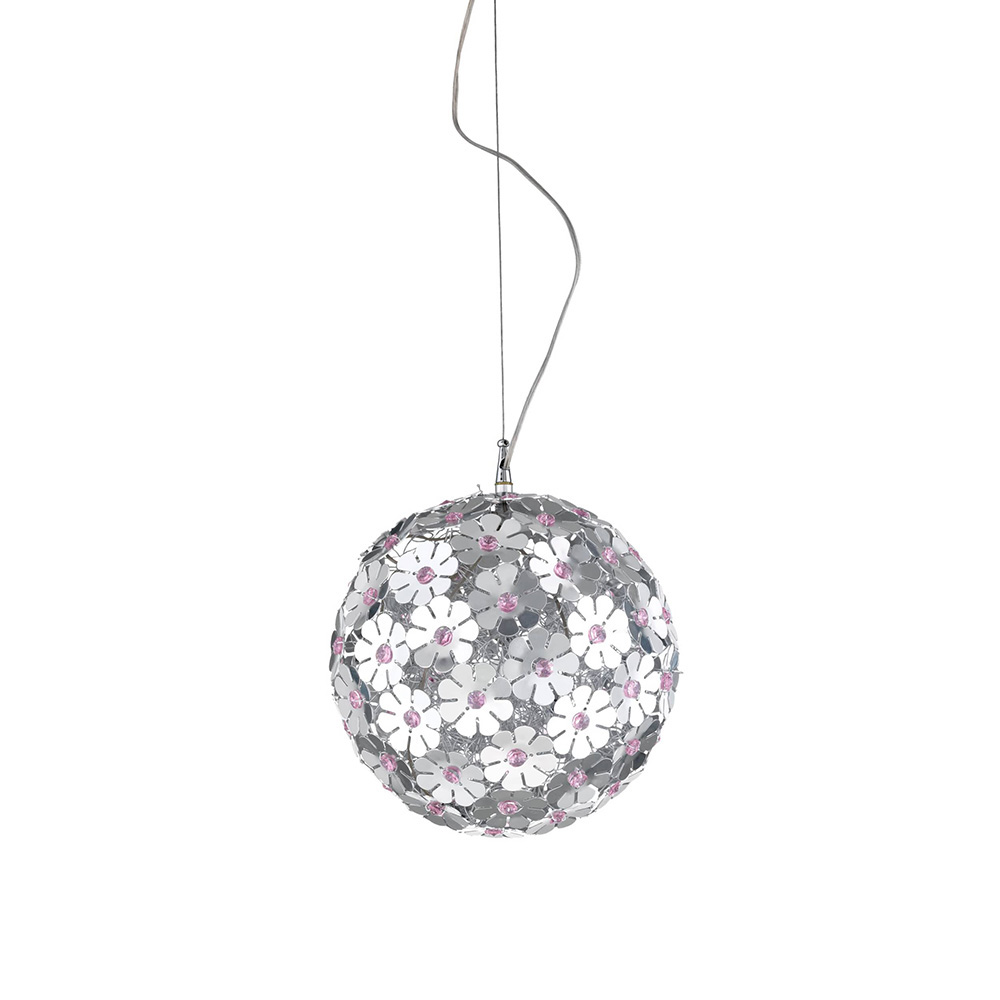Moderne Hängelampe mit rosafarbenen Kunststoffkristallen. Die Leuchte kann mit einem LED-Leuchtmittel bestückt werden.