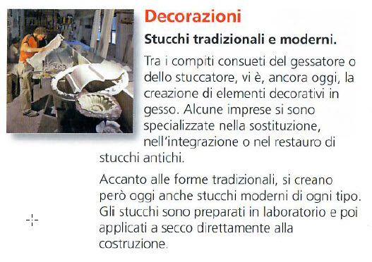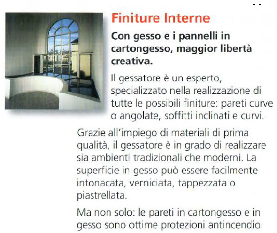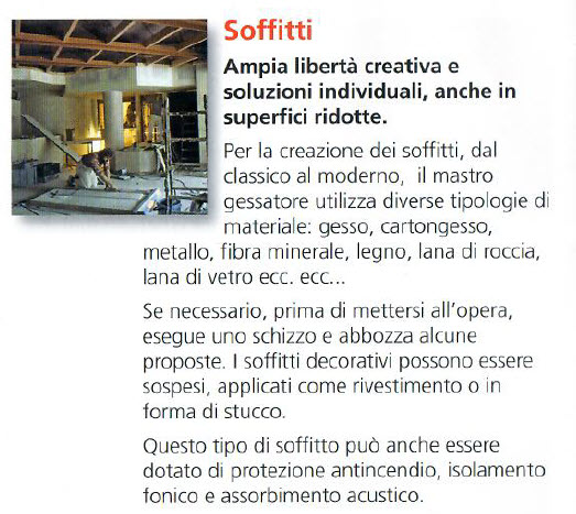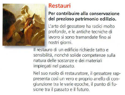 NON SOLO GESSO... I gessatori, oltre alla preparazione del gesso, degli intonaci e degli altri tipi di malta, si occupano di posare profilati d'acciaio e d'alluminio, montanti scanalati, profili angolari, tondini e tavole di legno, Inoltre intonacano, rivestono, costruiscono pareti e soffitti, realizzano pavimenti tecnici e contribuiscono cosi a garantire un perfetto isolamento, sia interno che esterno di un edificio. Queste sono le competenze dell'impresa ''VALSANGIACOMO M. Sagl'' , che da anni sul territorio ticinese mette a disposizione dei suoi clienti cordialità, serietà e professionalità. L'impresa ''VALSANGIACOMO M. Sagl'' e pronta a soddisfare i suoi clienti nei servizi di: - FINITURE INTERNE con gesso e pannelli per pareti curve, angolate e soffitti inclinati e curvi - PARETI A SECCO con montaggio rapido e isolamento - SOFFITTI con ampia libertà creativa per soluzioni individuali anche ridotte - SOFFITTI IN CARTONGESSO facili da montare per proteggere condotte di aerazioni e impianti vari - SOFFITTI FONOASSORBENTI per isolamento fonico e acustico - PAVIMENTI TECNICI E SOPRAELEVATI per risolvere il problema del livellamento con isolamento ottimale - INTONACI per equilibrare l'umidità dell'aria con un clima salutare e una maggiore igiene - ISOLAMENTI INTERNI termici, antincendio, contro l'umidità - ISOLAMENTI ESTERNI per un ottimo isolamento termico - DECORAZIONI con stucchi tradizionali e moderni - RESTAURI per preservare il prezioso patrimonio edilizio degli immobili antichi