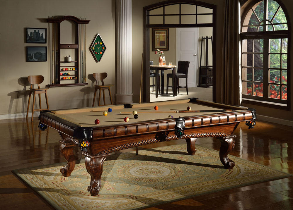 Eine handwerkliche Meisterleistung ist dem Hersteller dieses wunderschönen Poolbillardtisches gelungen! Das handbearbeitete Massivholz „African-Zebra-Wood“ wirkt klassisch und gleichzeitig nostalgisch im Antik-Look.Man kann sofort erkennen, dass alle Verzierungen und alle Ornamente mit größter Perfektion in kunstvoller Handarbeit und mit viel Liebe zum Detail geschaffen wurden.Der Unterbau und die Seitenträger sind mit ca. 40 mm Wandstärke wesentlich stabiler als bei vergleichbaren Modellen. Die 3-teilige 25 mm starke Naturschieferplatte kann auf diesem grandiosen Unterbau perfekt justiert werden und sorgt ein Leben lang für 100 % Stabilität.Die Farbe des Turnierbillardtuches „Original Simonis“ ist wahlweise ganz individuell wählbar. Auf der Oberfläche des Bandenrahmens sind die traditionellen Orientierungspunkte in Diamantform aus echtem Perlmutt eingearbeitet. Jeder der vier prunkvoll gedrechselten Holzfüße wird aus Massivholzblöcken aufwendig hergestellt, bevor zusätzliche Ornamente eingearbeitet werden. Das Modell Arizona ist in den Größen 8 ft. und 9ft.lieferbar und kann dank der zerlegbaren Konstruktion auch in sonst schwer zugängliche Räume transportiert werden. Alle Abmessungen und technische Voraussetzungen entsprechen den Deutschen sowie internationalen Normen, weshalb der Billardtisch nicht nur für zuhause, sondern auch für die Austragung von Meisterschaften hervorragend und stilistisch geeignet ist. Die hochwertigen, handgearbeiteten und stilistisch passenden schwarzen Echtledertaschen vollenden die einmalige Optik des Billardtisches. Mit der optional erhältlichen 2-teiligen Abdeckplatte verwandelt sich das Möbelstück im Handumdrehen in einen exklusiven Tisch! Masse und Gewicht 8 ft Aussenmasse: 254 x 142 cm Spielfeld: 224 x 112 cm Gewicht: ca. 410 kg