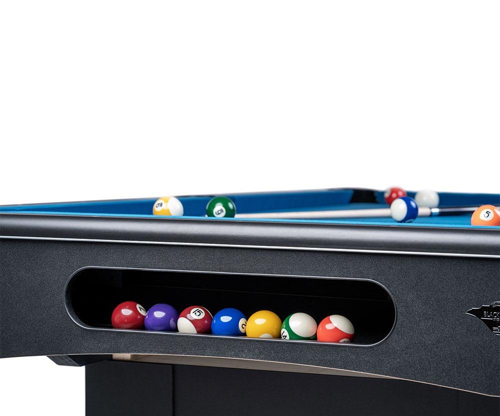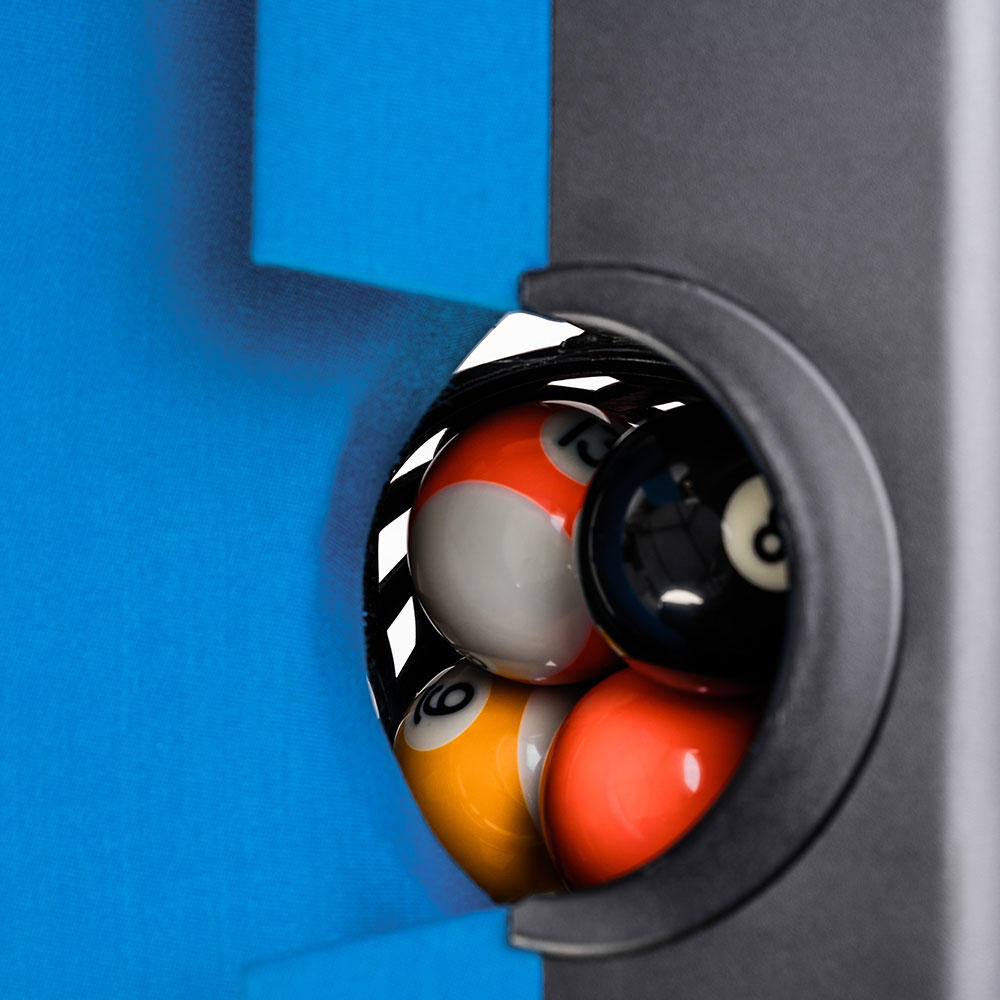 Tolle Optik und super Spieleigenschaften! Das Billard-Highlight in Sachen Preis-Leistungs-Verhältnis! Durch die 3-teilige, extra starke 25 Millimeter Naturschieferplatte bietet das Modell Black-Pool optimale Spiel- und Laufeigenschaften. Dadurch ist dieser Tisch nicht nur für den Privatgebrauch, für Schulen und Jugendheime, sondern auch als Trainingstisch für Turnierspieler bestens geeignet. Ein weiterer Vorteil liegt in der massiven Unterbaukonstruktion, die komplett zerlegbar ist. Somit kann dieser Tisch sehr leicht in sonst sehr schwer zugängliche Räumlichkeiten transportiert werden. Die höhenverstellbaren, grossen Balkenfüsse sorgen zusätzlich für ein Höchstmass an Stabilität. Die professionellen, aus Naturkautschuk bestehenden Vollgummibanden bieten den optimalen und vorgeschriebenen Kugelrückstoss. Das electric-blue-farbene Billardtuch ist sehr strapazierfähig und garantiert präzisen Kugellauf. Der Billardtisch ist mit geräuscharmen Einfalltaschen (Pockets) ausgestattet. An der Stirnseite ist zusätzlich eine nützliche Ballablage integriert. Das hochwertige, schwarze Aussendekor ist nicht nur schlag- und kratzfest sondern auch temperaturbeständig. Grössen und Abmessungen 6 ft Aussenmasse: 212 x 121 x 81 cm, Spielfeld: 180 x 90 cm, Gewicht: ca. 250 kg 7 ft Aussenmasse: 230 x 131 x 81 cm, Spielfeld: 198 x 99 cm, Gewicht: ca. 280 kg 8 ft Aussenmasse: 256 x 144 x 81 cm, Spielfeld: 224 x 112 cm, Gewicht: ca. 330 kg 9 ft Aussenmasse: 286 x 159 x 81 cm, Spielfeld: 254 x 127 cm, Gewicht: ca. 380 kg Beinfreiheit Unterkante Blendbrett zum Boden . 57 - 60 cm (Blende etwas geschwungen) Optional auch mit Abdeckplatte erhältlich!