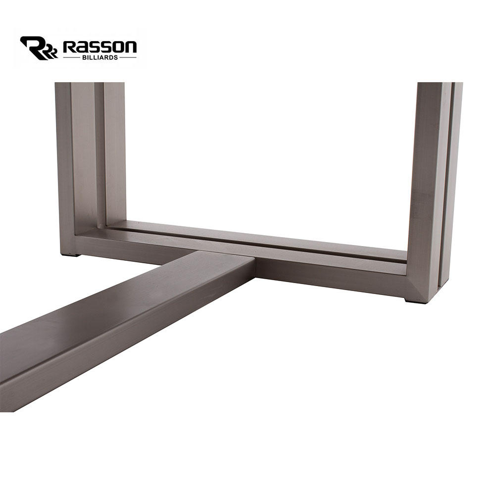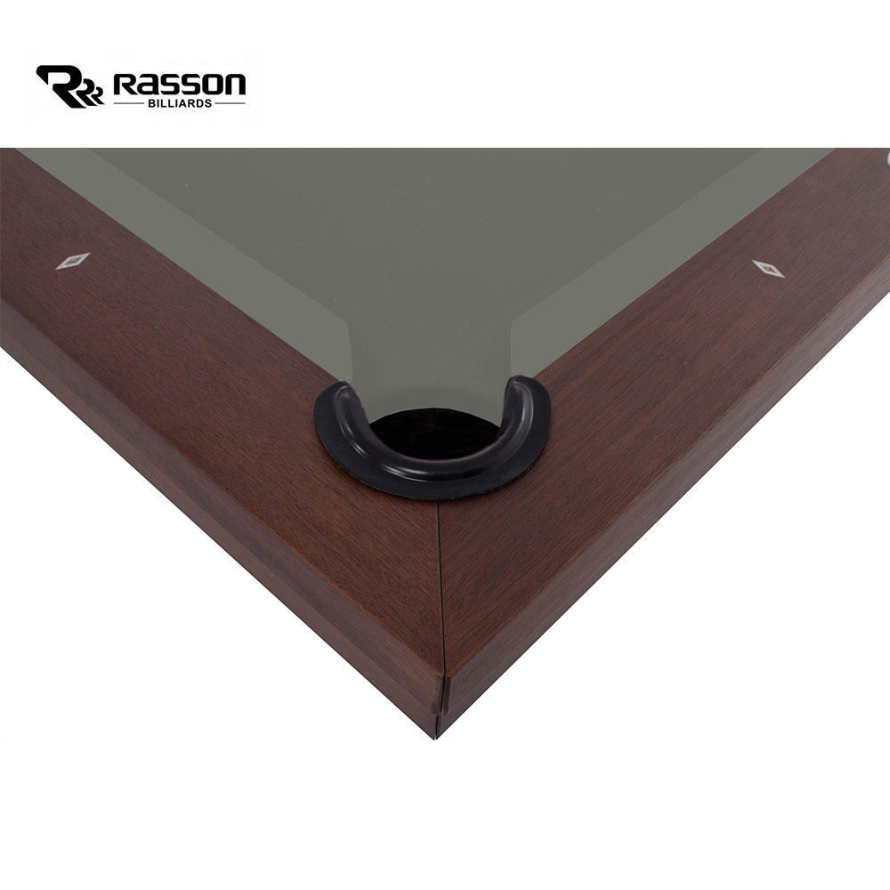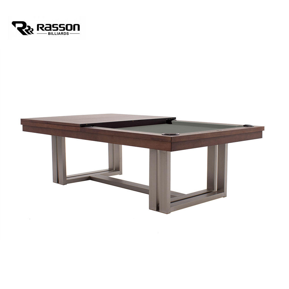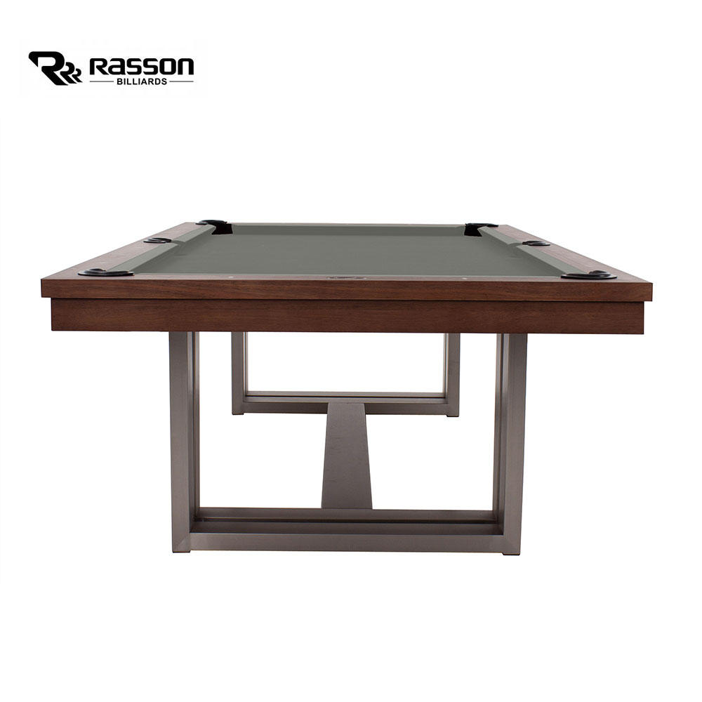 SORGT FÜR HOCHSTIMMUNG IN IHREM ZUHAUSE! Der Trillium Billardtisch von Rasson wurde extra für eine angenehme Nutzung als Esstisch bezüglich der Sitzhöhe entwickelt. Mit diesem Billardtisch von Rasson erhalten Sie den ultimativen Freizeitspass und begeistern Ihre Familie und Freunde. Der hochwertige Tisch ist aus massivem Hartholz mit Walnussfurnier gefertigt. Äusserst belastbare Beine aus Edelstahl geben Stabilität und verleihen ihm einen einzigartigen Look. Mit der optionalen Abdeckplatte lässt er sich schnell und einfach in einen Esstisch verwandeln und bietet Platz für bis zu 12 Personen. Extra für eine angenehme Nutzung als Esstisch bezüglich der Sitzhöhe. Der Tisch verfügt über Innentaschen aus Leder. K66-Bandengummis aus Naturkautschuk sorgen für einen präzisen Rückprall. Eine hochwertige, dreiteilige, 20 mm Rasson-Naturschieferplatte sowie ein Rahmen aus solidem Stahl ermöglichen ein präzises Rollen der Kugeln. Massives Hartholz Walnussfurnier Platz für bis zu 12 Personen (als Esstisch) 3-teilige, 20 mm Naturschieferplatte Stabiler Unterbau aus Edelstahl die Spielfläche lässt sich durch 12 im Rahmen verankerte Stellschrauben millimetergenau justieren K66-Banden mit präzisem Abprall Innentaschen aus Leder Abmessung Tisch: 2,56 m x 1,45 m, Höhe 0,78 m Abmessung Spielfläche: 2,26 m x 1,13 m Gewicht: Tisch 161 kg netto (175 kg brutto) + Schiefer 172 kg Tischhöhe inkl. optionaler Abdeckung 0,81 m Beinfreiheit: 0,64 m optimale Grösse des Raumes: 5,26 m x 4.13 m vollständig zerlegt und in 7 Kartons verpackt (Somit kann dieser Tisch sehr leicht in sonst sehr schwer zugängliche Räumlichkeiten transportiert werden)