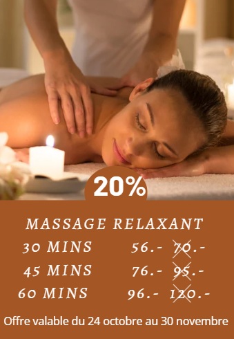 Du 24 octobre au 30 novembre, profitez de -20% sur nos massages relaxants 💆♀️ Lâchez prise, relâchez les tensions et laissez-vous envelopper par une parenthèse de bien-être dans une ambiance douce et apaisante. 🌸 30min. 56.- au lieu de 70.- 45min. 76.- au lieu de 95.- 60min. 96.- au lieu de 120.- 📅 Réservez dès maintenant votre moment de relaxation en ligne ou par téléphone au 021 921 51 61
