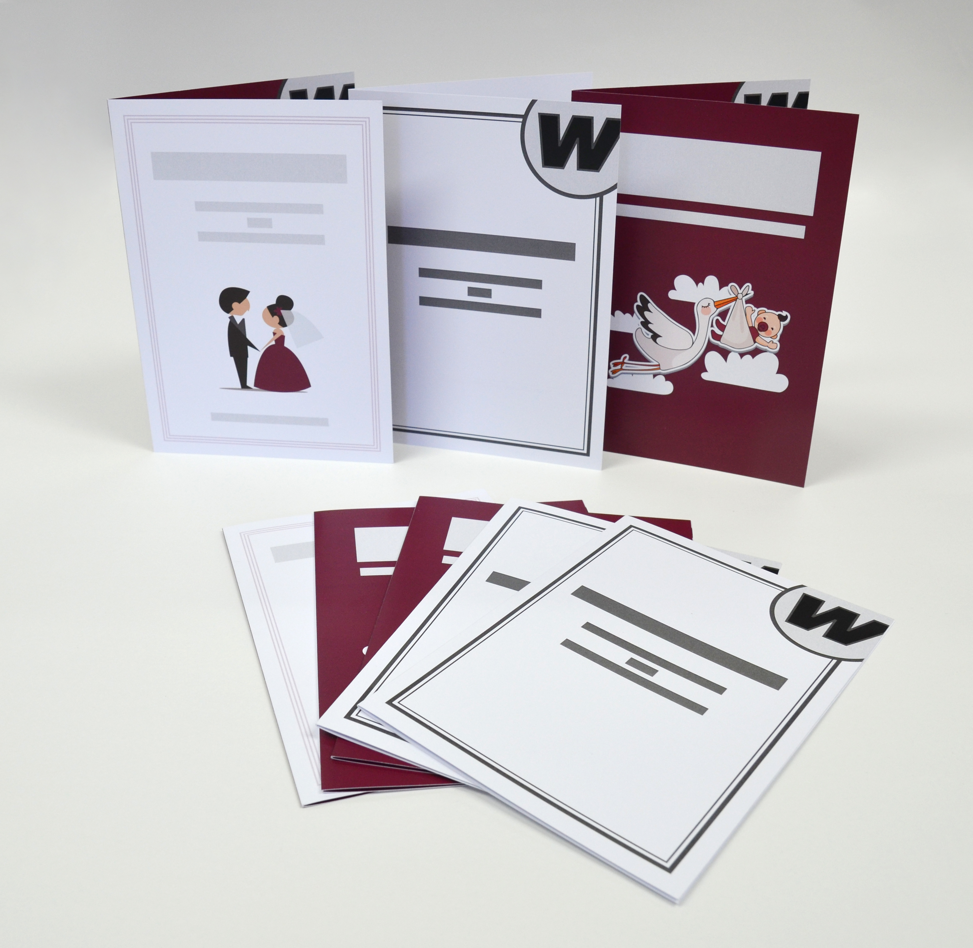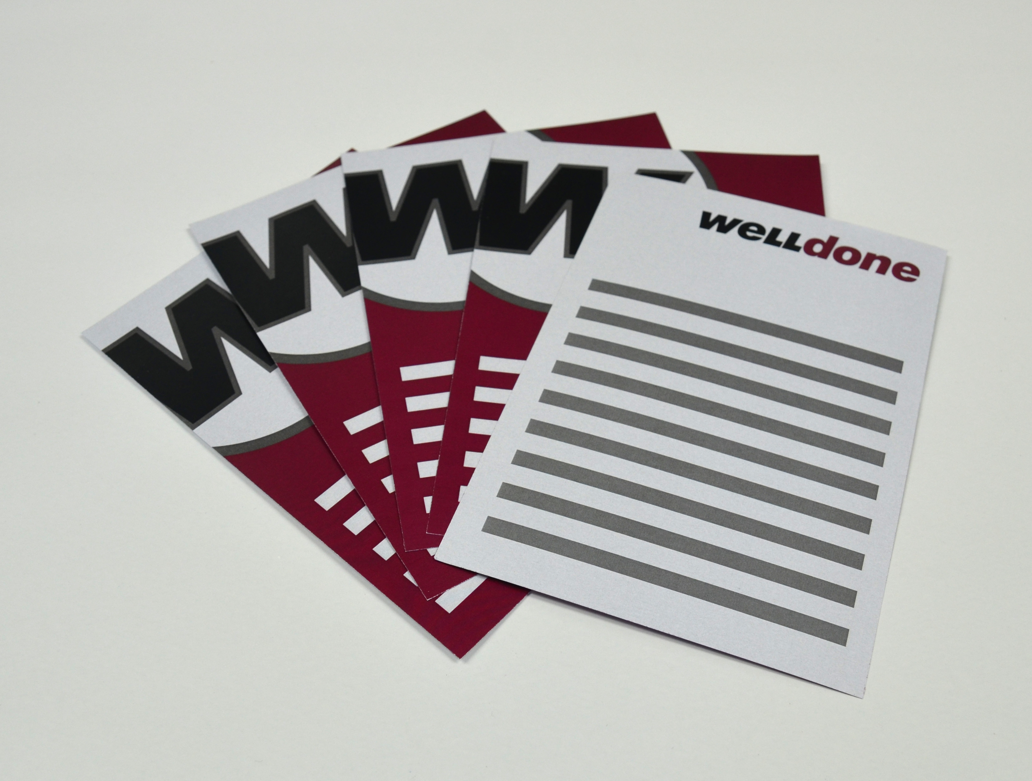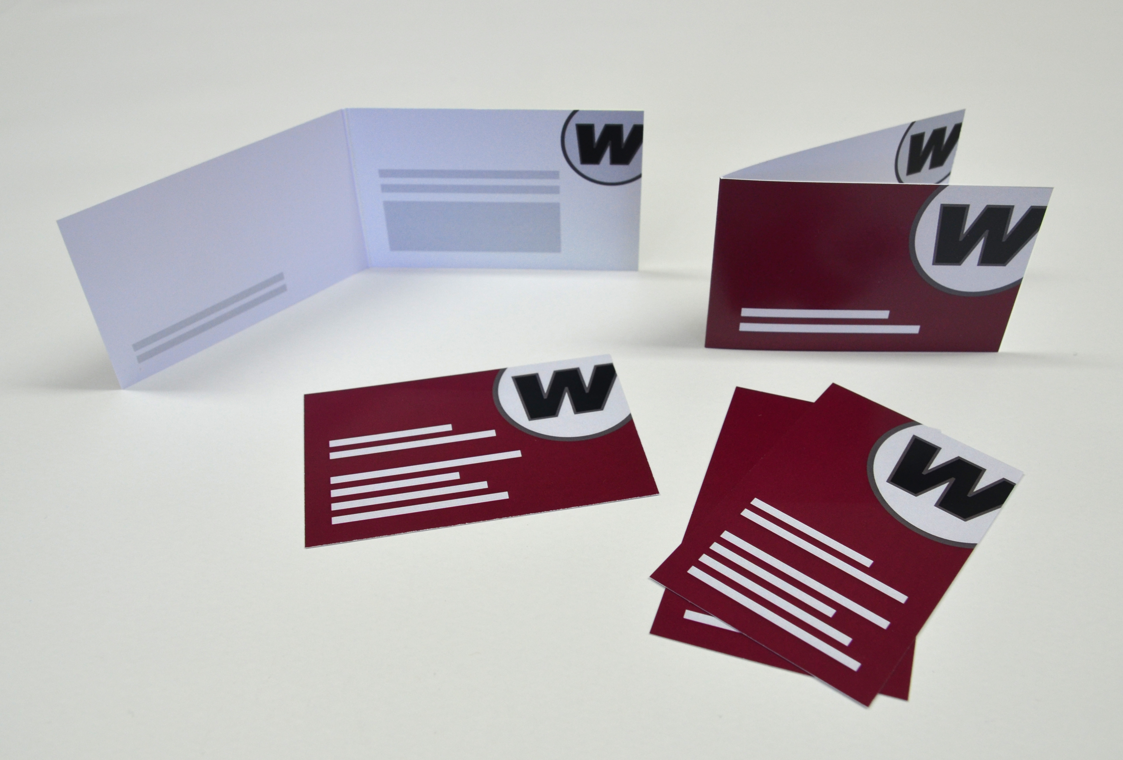 Karten auf Postkarten-Papier gedruckt (Vorderseite gestrichen, Rückseite matt) oder sonstiges Wunsch-Papier, farbig oder s/w